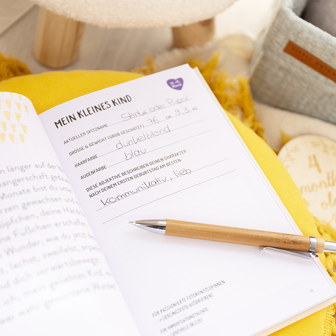 - Platz für Meilensteine des Babys und Gedanken und Gefühle der Mutter