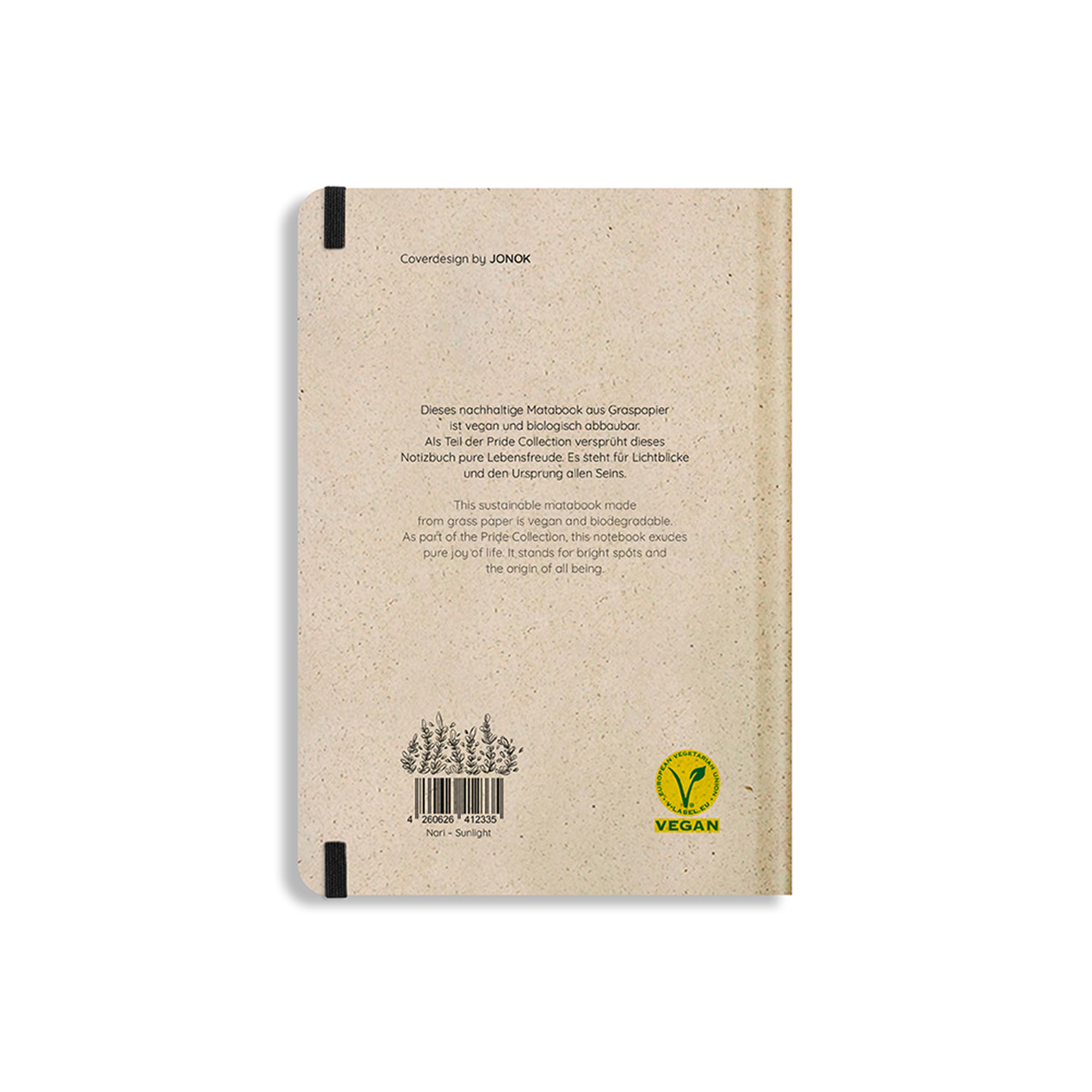 Format 21,5 x 14,4 cm, 90 g/m² Süßgraspapier (bestehend aus landwirtschaftlichen Abfällen von z.B. Reis-, Getreide- und Zuckerrohrpflanzen), Hardcover aus Graspapier (bis zu 50% Grasfaseranteil, Frischfaseranteil aus FSC-zertifizierten Wäldern), 138 Seiten punktkariert, Öko-Tex-zertifiziertes Lesezeichen und Gummiband, Fadenheftung, Öko-Druckfarben.