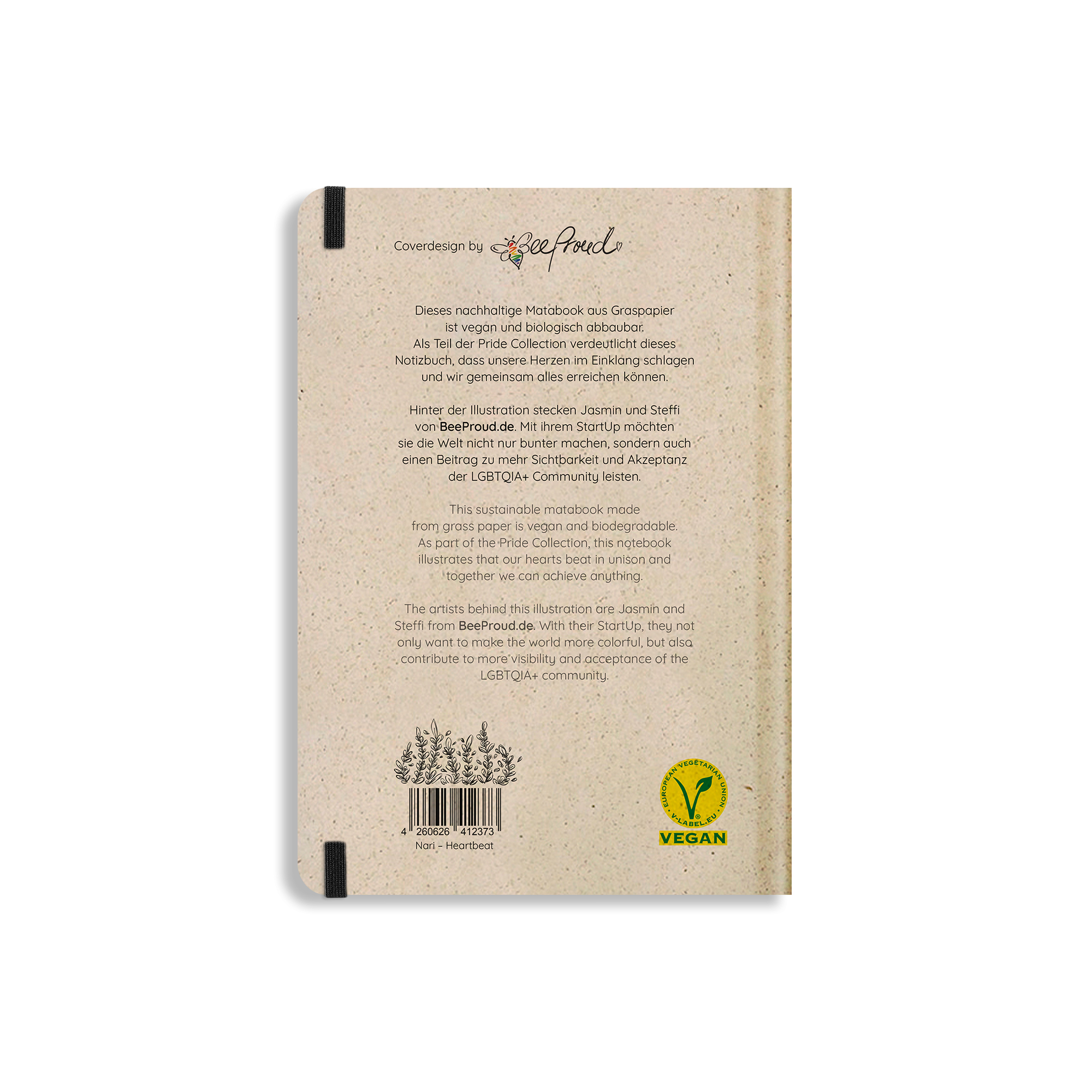Illustriert von BeeProudUnsere Pride Collection steht für Toleranz, Einzigartigkeit und Liebe. Das Nari Heartbeat verdeutlicht, dass unsere Herzen im Einklang schlagen und wir gemeinsam alles erreichen können. Hinter der Illustration stecken Jasmin und Steffi von BeeProud.de. Mit ihrem Projekt möchten sie die Welt diverser und bunter machen.Dieses Notizbuch ist Teil unserer Pride Collection, mit der wir aktiv die queere Community unterstützen möchten. Für jedes verkaufte Nari-Notizbuch unserer Pride Collection geht ein Teil des Erlöses an das Projekt 100% MENSCH. Das wundervolle Team dahinter sorgt für queere Aufklärung, Bildung und Sichtbarkeit. Mehr dazu findest du hier: https://100mensch.de/Verwendbar als umweltfreundliches Notizbuch, Bullet Journal (Planer) oder Tagebuch. Perfekt geeignet als nachhaltiges Geschenk für dich und deine Liebsten.Auf dem Süßgraspapier können alle Stifte und Farben verwendet werden, die du dir vorstellen kannst. Dank seiner natürlichen Robustheit franst Tinte nicht aus und drückt auch nicht auf der Rückseite durch.Technische AngabenFormat 21,5 x 14,4 cm, 90 g/m² Süßgraspapier (bestehend aus landwirtschaftlichen Abfällen von z.B. Reis-, Getreide- und Zuckerrohrpflanzen), Hardcover aus Graspapier (bis zu 50% Grasfaseranteil, Frischfaseranteil aus FSC-zertifizierten Wäldern), 138 Seiten punktkariert, Öko-Tex-zertifiziertes Lesezeichen und Gummiband, Fadenheftung, Öko-Druckfarben.Matabooks - nachhaltig, fair und vegan