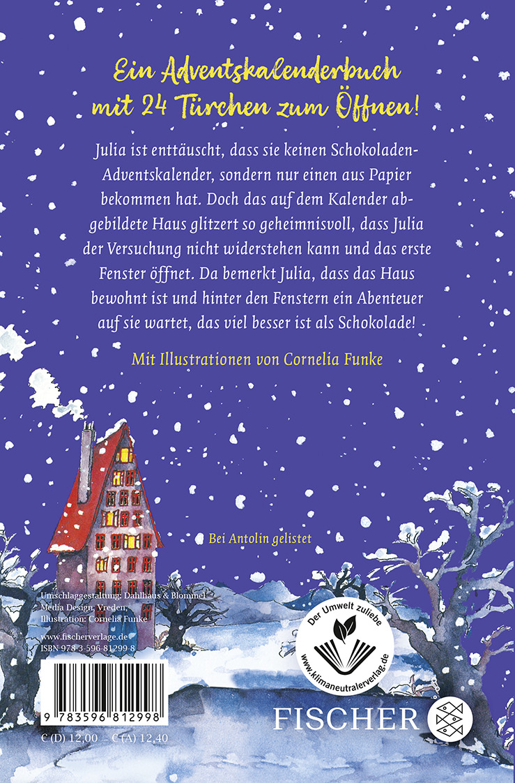 Diese Ausgabe von »Hinter verzauberten Fenster« ist Buch und Adventskalender in einem! Gemeinsam mit Julia können die Leser:innen ein Türchen nach dem nächsten öffnen. Dahinter verbergen sich von Cornelia Funke selbst liebevoll gezeichnete Illustrationen.