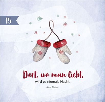 | Schlagworte | Advent • Adventskalender • Adventskalender für Erwachsene • Adventszeit • Aquarell-Motiv • Atempause • Aufstellbuch • Bibelverse • Claudius • Dietrich Bonhoeffer • Fallersleben • [Format:] Aufstellbuch • Friedrich von Bodelschwingh • Johannes Sebastian Bach • Martin Luther • Max Lucado • Paul Gerhardt • Weihnachten • Zitate |