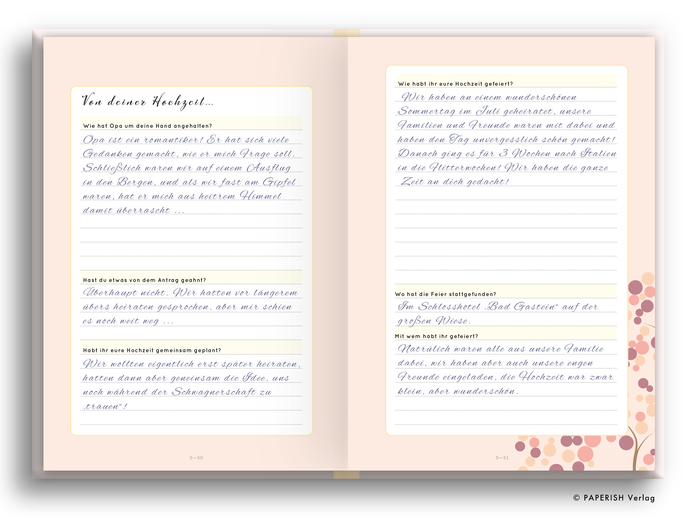 Kundenstimme: "Das Buch wurde an die Oma verschenkt und sie hat sich sehr gefreut. Sie schreibt nun ihre Lebensgeschichte darin auf, für die Nachwelt. Einfach toll. Das Buch ist grob wie folgt aufgeteilt: Von den Wurzeln, Von der Liebe, Von Dir, Vom Leben und Von mir und meinen Geschwistern (jeweils aus Oma-Perspektive). Ich freue mich schon das alles zu lesen."