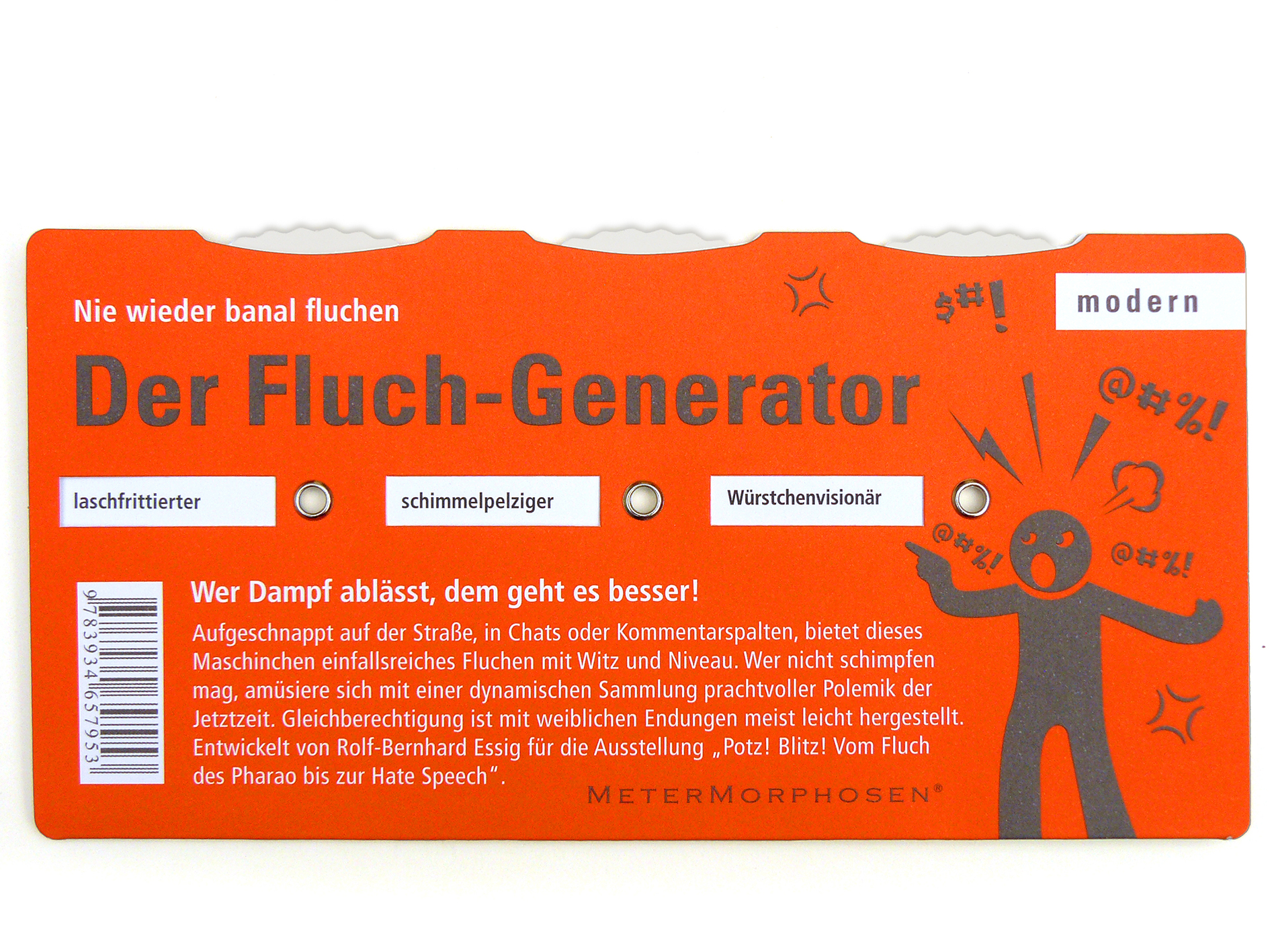Der Fluch-Generator ist eine faszinierende Wortmaschine aus fester Pappe, die 3.375 klassische und 3.375 moderne Flüche kombiniert. Während die Begriffe auf der klassischen Seite von Hans Sachs und Goethe stammen, ist die moderne Seite zur Gänze Volkes heutiger Stimme abgelauscht. Aufgeschnappt auf der Straße, in Chats oder Kommentarspalten, bietet der Fluch-Generator einfallsreiches Schimpfen auf hohem Niveau. Von Rolf-Bernhard Essig anlässlich seiner Ausstellung über das Fluchen in Frankfurt, Berlin und Nürnberg.Spieleranzahl: 2 bis unendlich.Spieldauer: ca. 20 Minuten