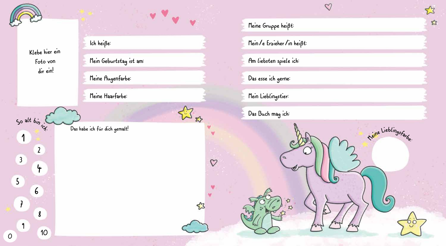 Für jede kleine Einhornfreundin gibt es die perfekte Seite zum Eintragen. Was ist euer Lieblingsessen? Was mögt ihr überhaupt nicht? Und was spielt ihr am liebsten? Dieses magische Freundealbum bietet viel Platz für Fotos und zum Malen eigener kleiner Kunstwerke. Das Papier ist für Filzstifte und Wasserfarben geeignet.