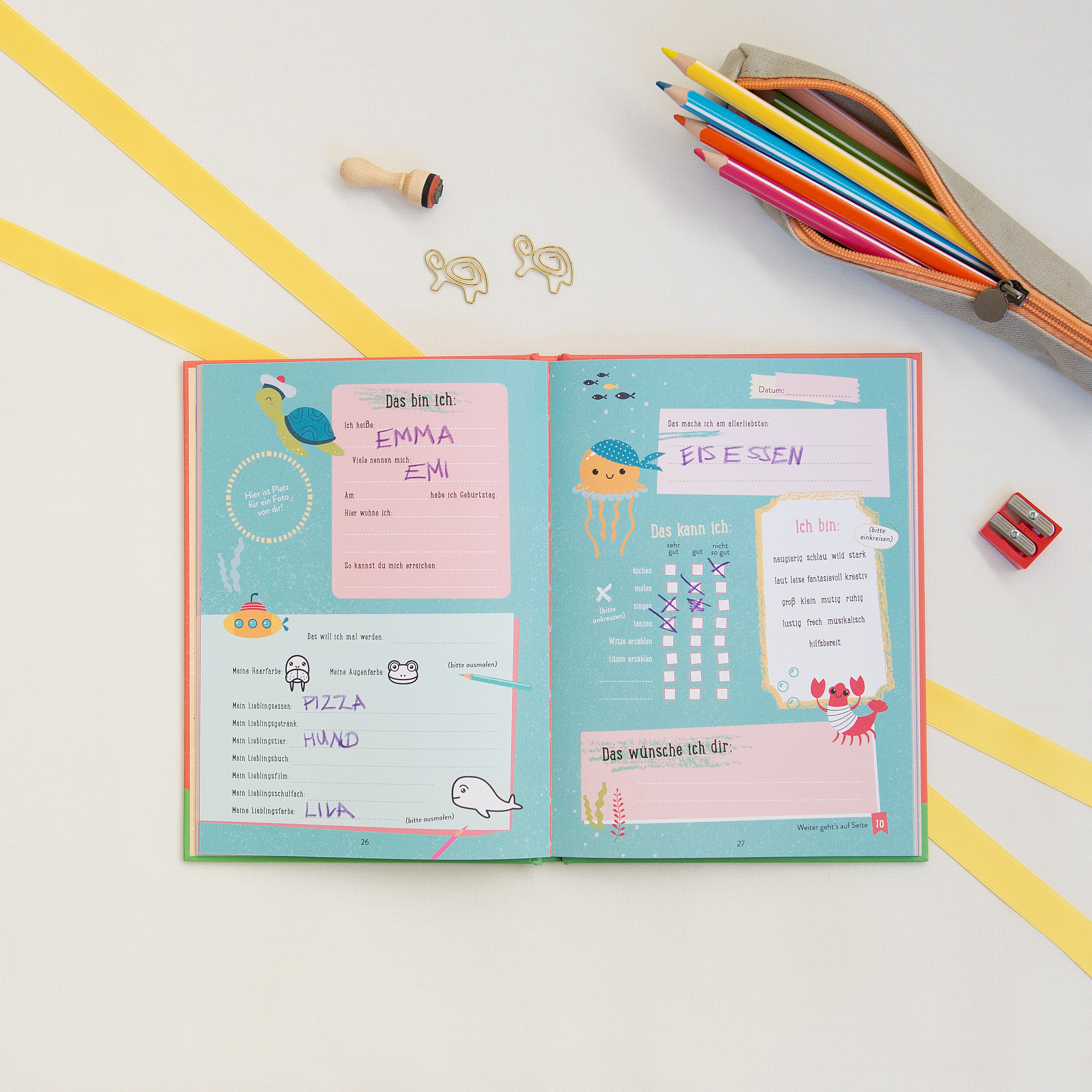 - Zusätzlich kreative Seiten für alle, z. B. »Unsere lustigsten Witze« oder »Unsere größten Geheimnisse«