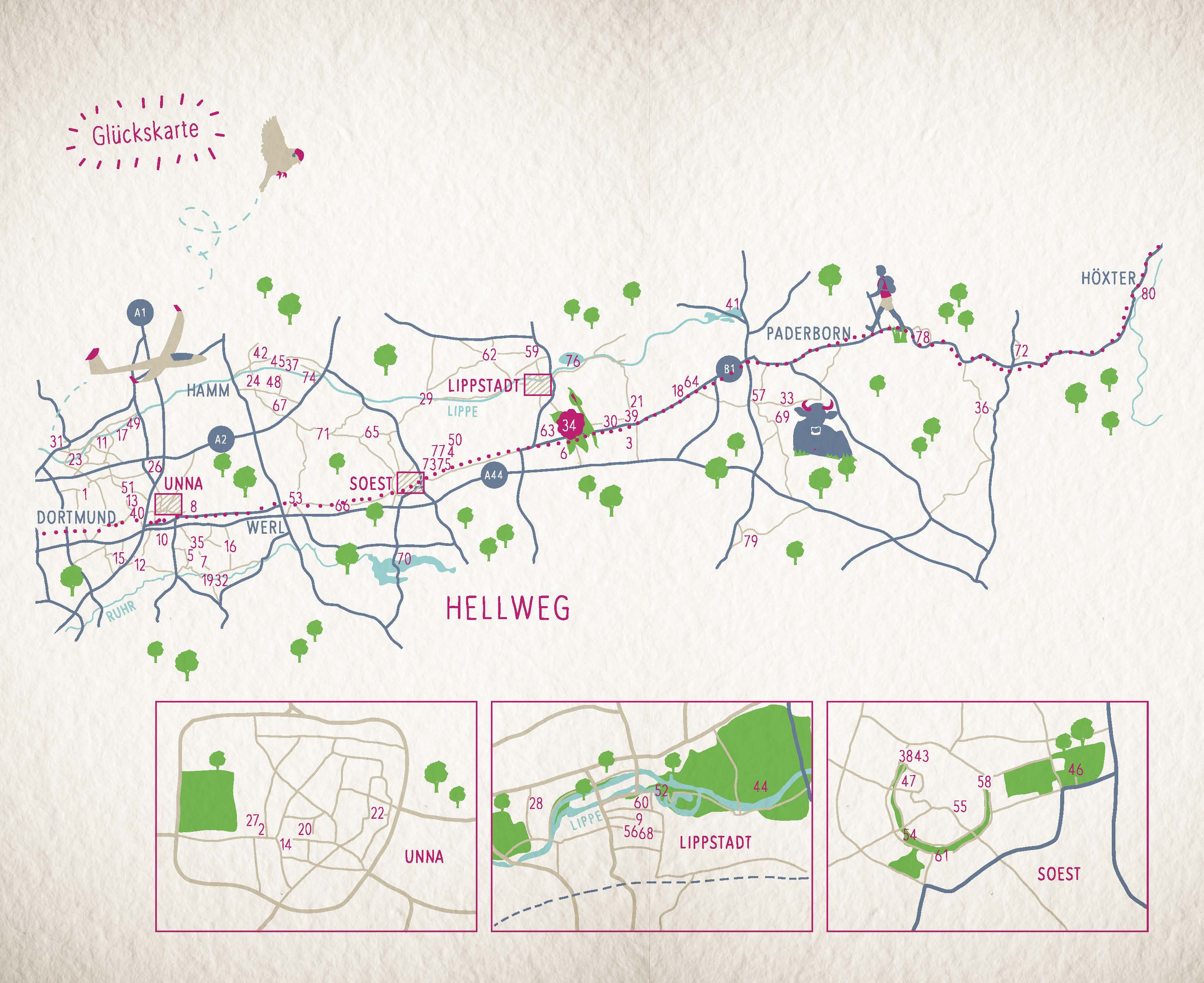 Herzlich willkommen am Hellweg, der Straße zum Glück! Entlang der alten Handelsroute reist man quer durch Westfalen und entdeckt hinter jeder Kurve zauberhafte Orte: verborgene Quellen und lauschige Auen, historische Gemäuer und gemütliches Fachwerk, gläserne Elefanten und Kunstwerke aus Licht. Bunter Kirmestrubel, mörderisch spannende Festivals und romantische Schlösser lassen die Herzen höherschlagen. Am Hellweg werden Glückssuchende gleich kilometerweise fündig!