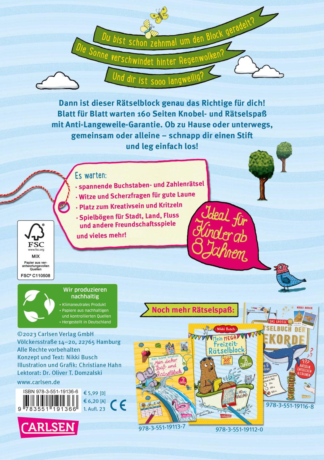 Ob zu Hause oder im Urlaub, allein oder zusammen - mit diesem Block kommt garantiert keine Langeweile auf. Blatt um Blatt können Kinder ganz neue Zahlenrätsel und Buchstabengitter lösen, Fehler finden, über Labyrinthen knobeln, Paare zuordnen und viele weitere Rätsel entdecken. Es gibt ganz viel Platz zum Kritzeln und Schreiben.