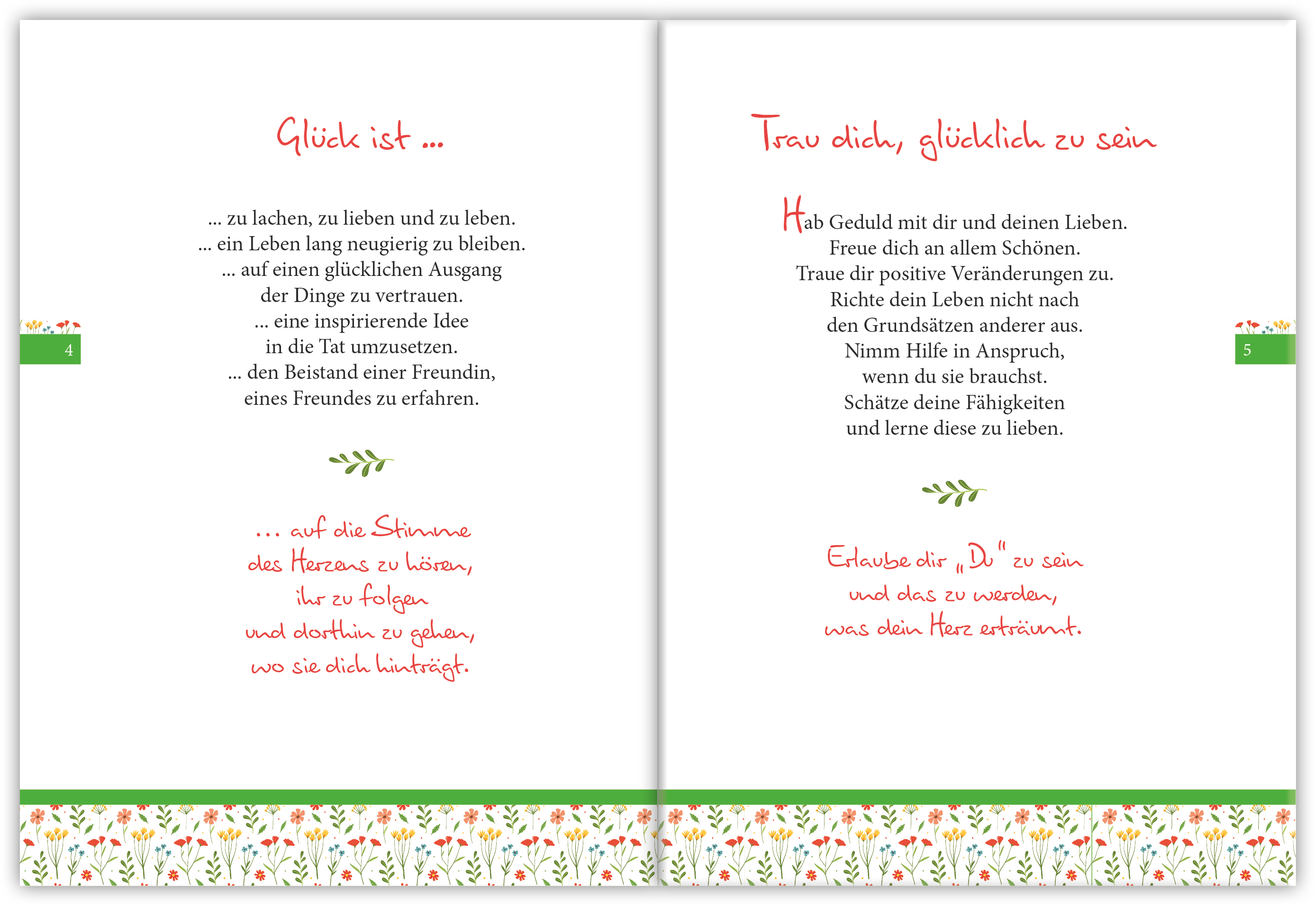 Glücksideen verschenkenErfrischende Texte von Maria Wiesinger rund ums Glücklichsein machen dieses wunderschön gestaltete Geschenkheft zu einem idealen Mitbringsel für einen lieben Menschen zu verschiedenen Anlässen, zum Beispiel zum Geburtstag, Muttertag oder als kleines Dankeschön für Zwischendurch. Das Heft kann auch als kleine Überraschung mit der Post verschickt werden.- Segenswünsche und Texte, die glücklich machen- Ideal als kleines Mitbringsel für verschiedene Anlässe- Mit Widmungseite für einen persönlichen Gruß- Auch zum Versenden per Post geeignet- Mit Prägung auf dem Cover