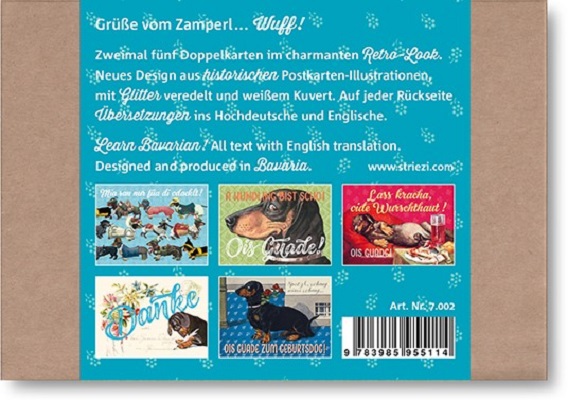 Wuff! Zehn fröhlich leuchtende und edel glitzernde Dackelkarten aus Bayern in einer Box. Ein herzlicher Gruß vom "Zamperl", originell und auf bayerisch. Das handliche Grußkarten-Set des bayerischen Kult-Labels Striezi® ist ideal zum verschenken oder selber schreiben. Die mit Glitter veredelten Klappkarten aus historischen Postkartenmotiven des geliebten "Münchner-Bierdackels" machen gute Laune und sind mit viel Liebe zum Detail hochwertig hergestellt - selbstverständlich "dahoam" in Bayern.