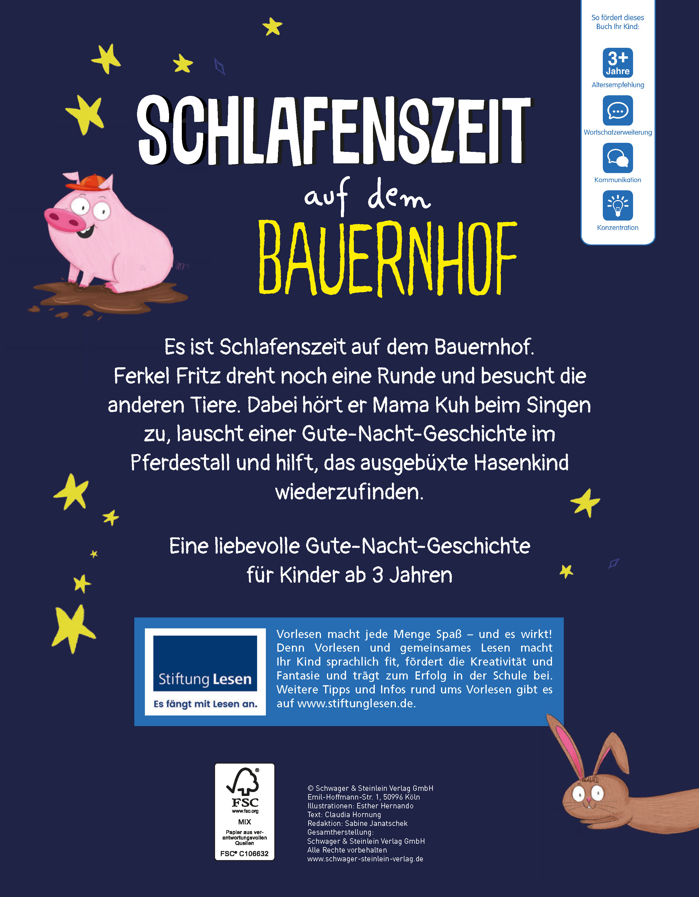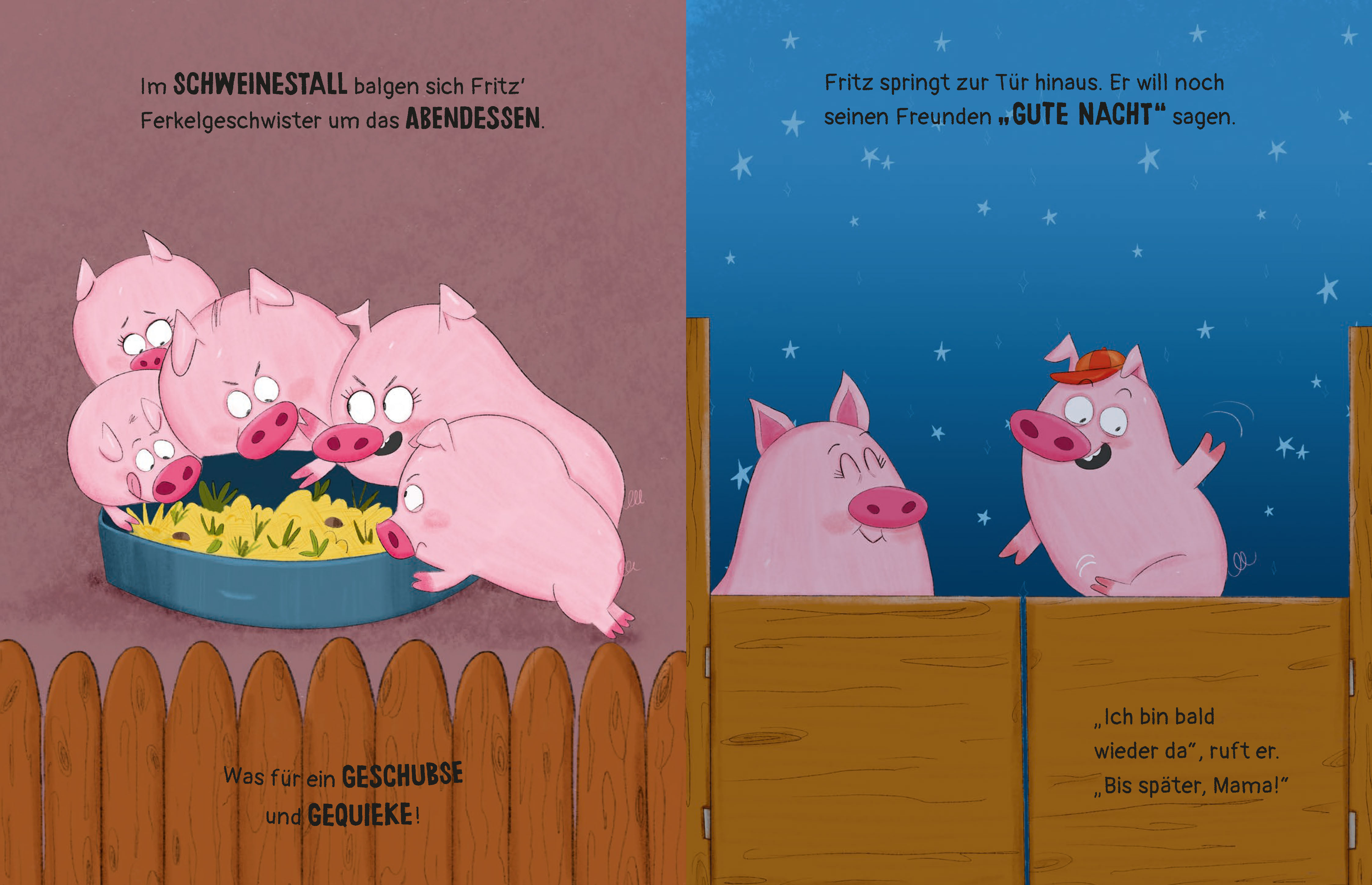 Schweinchen Fritz nimmt die kleinen Leser und Zuhörer mit auf seine abendliche Reise und bereitet auf das Schlafengehen vor. Liebevolle Illustrationen von Esther Hernando tauchen die Geschichte ins dunkelblaue Abendlicht und erwecken die Charaktere zum Leben. Das neugierige Ferkel zeigt nebenbei, wie man seinen Mitmenschen (oder auch Mittieren) hilfsbereit gegenübertritt. Eine tierisch gute Geschichte vor dem Einschlafen. Für Kinder ab 3 Jahren.