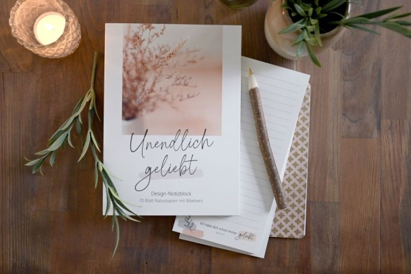 Im Alltag rauschen unzählige Gedanken durch unseren Kopf. "Unendlich geliebt" bietet eine stilvolle Methode, um Ideen, Gedanken und Notizen festzuhalten, bevor sie in Vergessenheit geraten. Dieser wunderschön gestaltete Schreibblock mit hochwertiger Ausstattung, Naturpapier und Bibelvers ist ein echter Hingucker!