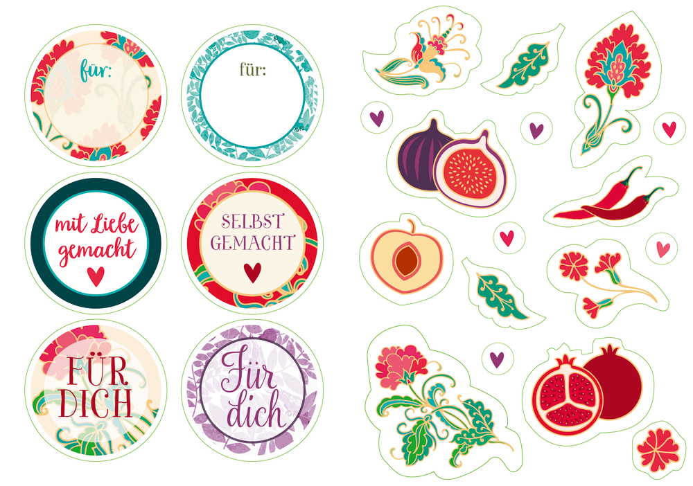 | Schlagworte | Aufkleber • Deko-Aufkleber • Dekorieren • Einmachetiketten • Essen & Trinken • Etiketten • Früchte • Küchensticker • Orientalische Muster • Sticker • Sticker für Geschenke • Stickerheft • Sticker zum Beschriften |