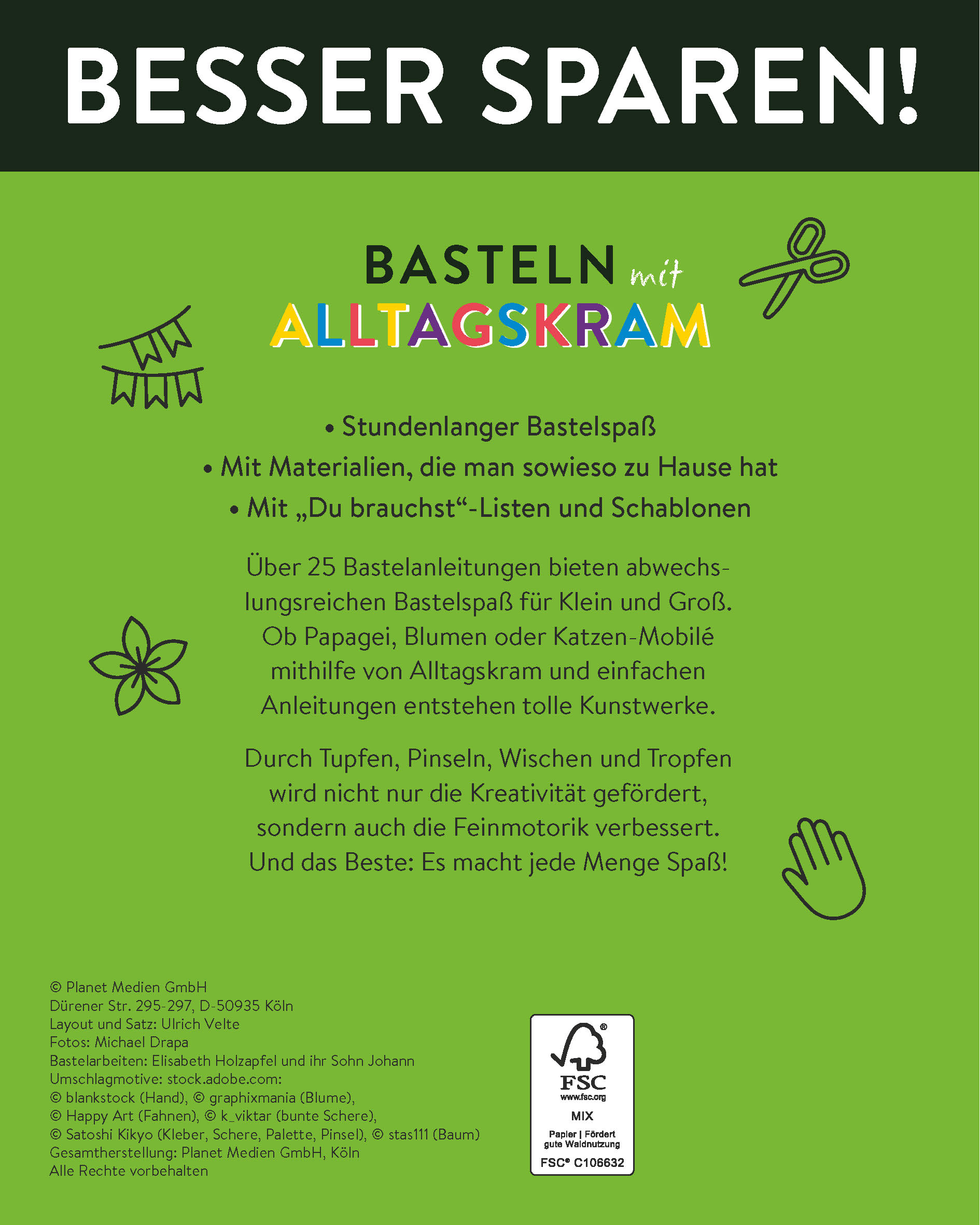 Über 25 Bastelanleitungen bieten abwechslungsreichen Bastelspaß für Klein und Groß. Ob Papagei, Blumen oder Katzen-Mobilé mithilfe von Alltagskram und einfachen Anleitungen entstehen tolle Kunstwerke. Durch Tupfen, Pinseln, Wischen und Tropfen wird nicht nur die Kreativität gefördert, sondern auch die Feinmotorik verbessert. Und das Beste: Es macht jede Menge Spaß!