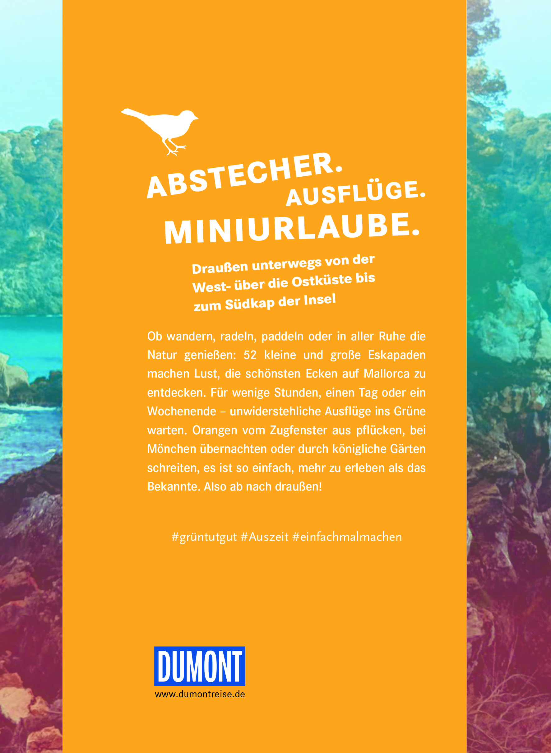 Ob wandern, radeln, paddeln oder in aller Ruhe die Natur genießen: 52 kleine und große Eskapaden machen Lust, die schönsten Ecken auf Mallorca zu entdecken. Für wenige Stunden, einen Tag oder ein Wochenende - unwiderstehliche Ausflüge ins Grüne warten. Orangen vom Zugfenster aus pflücken, bei Mönchen übernachten oder durch königliche Gärten schreiten, es ist so einfach, mehr zu erleben als das Bekannte. Also ab nach draußen!