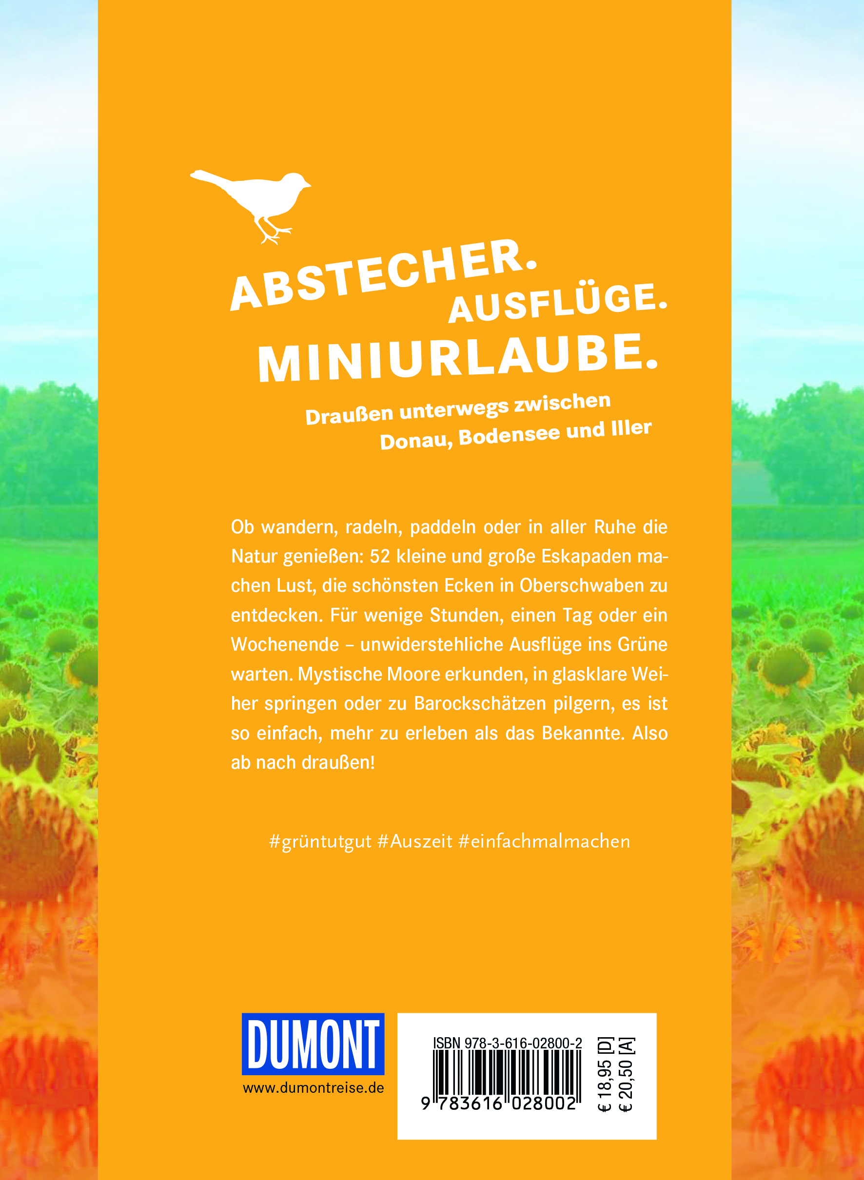 Ob wandern, radeln, paddeln oder in aller Ruhe die Natur genießen: 52 kleine und große Eskapaden machen Lust, die schönsten Ecken in Oberschwaben zu entdecken. Für wenige Stunden, einen Tag oder ein Wochenende - unwiderstehliche Ausflüge ins Grüne warten. Mystische Moore erkunden, in glasklare Weiher springen oder zu Barockschätzen pilgern, es ist so einfach, mehr zu erleben als das Bekannte. Also ab nach draußen!