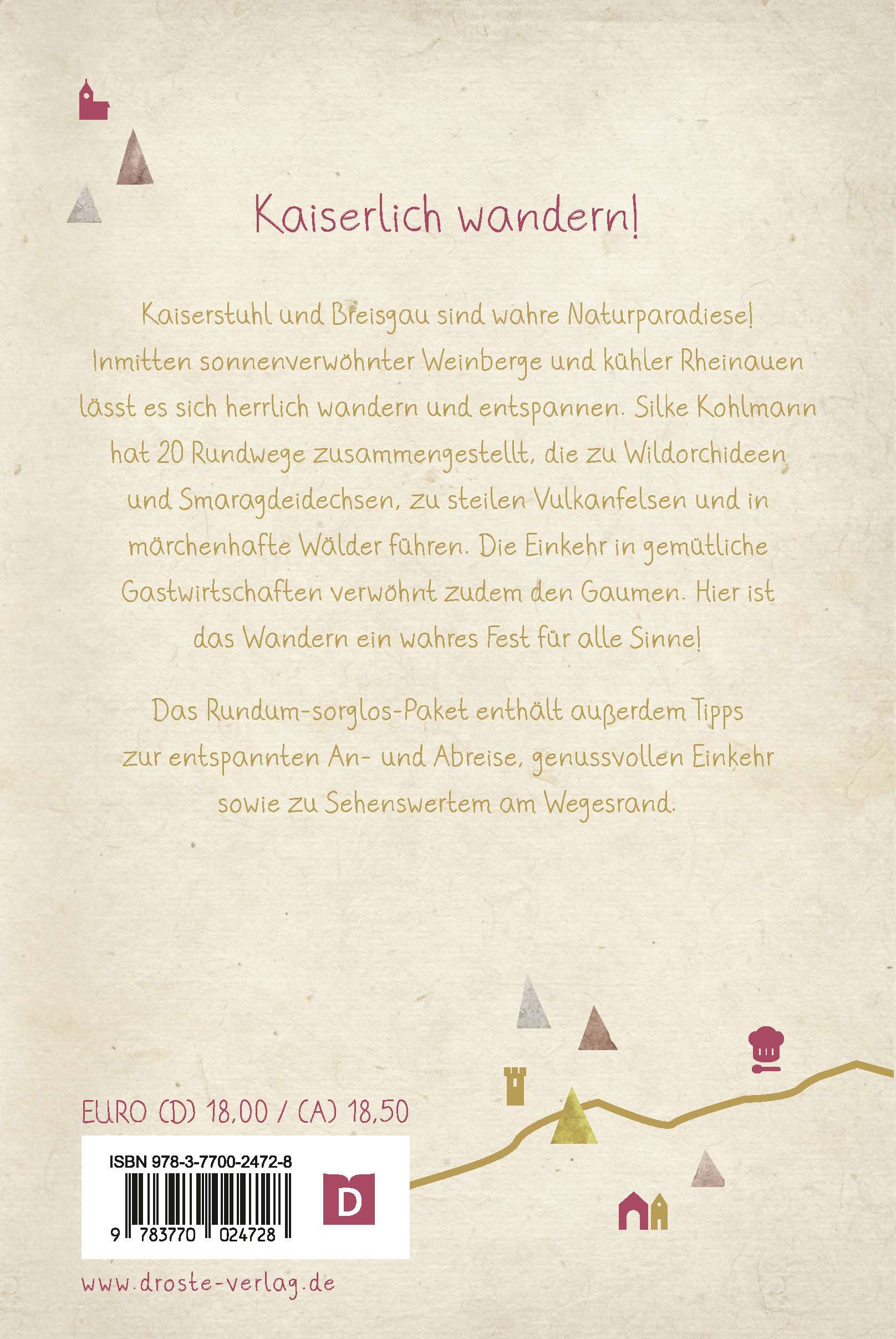 Kaiserstuhl und Breisgau sind wahre Naturparadiese! Inmitten sonnenverwöhnter Weinberge und kühler Rheinauen lässt es sich herrlich wandern und entspannen. Silke Kohlmann hat 20 Rundwege zusammengestellt, die zu Wildorchideen und Smaragdeidechsen, zu steilen Vulkanfelsen und in märchenhafte Wälder führen. Die Einkehr in gemütliche Gastwirtschaften verwöhnt zudem den Gaumen. Hier ist das Wandern ein wahres Fest für alle Sinne!Das Rundum-sorglos-Paket enthält außerdem Tipps zur entspannten An- un Abreise, genussvollen Einkehr sowie zu Sehenswertem am Wegesrand.Mit Tipps zur entspannten An- und Abreise, genussvollen Einkehr und zu Sehenswertem am Wegesrand wird ein rundum-sorglos-Paket daraus.Unsere Wanderbücher bieten echte Wohlfühlwege für jede Stimmung. Mit eindrucksvollen Fotos, berührenden Texten und abwechslungsreichen Touren wird jede Wanderung zum besonderen Erlebnis. Entspannung und Inspiration garantiert - ideal auch als Geschenk!