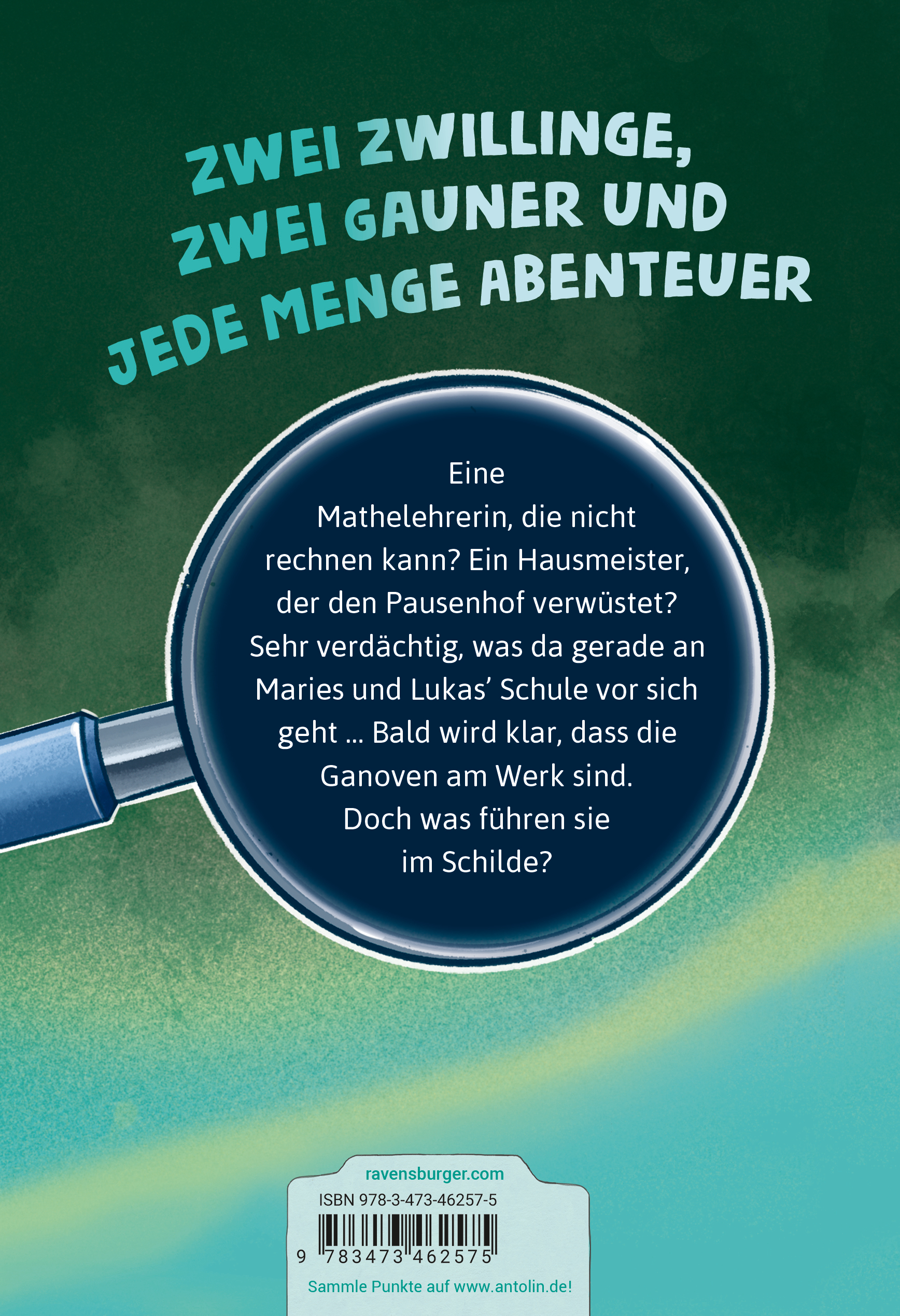 Komisch! Die neue Mathelehrerin von Marie und Lukas, Frau von und zu Schwindel, kann gar nicht rechnen. Und der neue Hausmeister, Herr Besenrein, macht auch einen verdächtigen Eindruck... Moment mal, sind das nicht die beiden Ganoven? Sicher führen sie wieder etwas im Schilde! Und wirklich: Die beiden Schurken planen einen Überfall auf die Bank, die direkt neben der Schule liegt. Ob die Zwillinge ihren Plan vereiteln können? Band 6 der erfolgreichen Reihe, spannender und kniffliger als je zuvor!