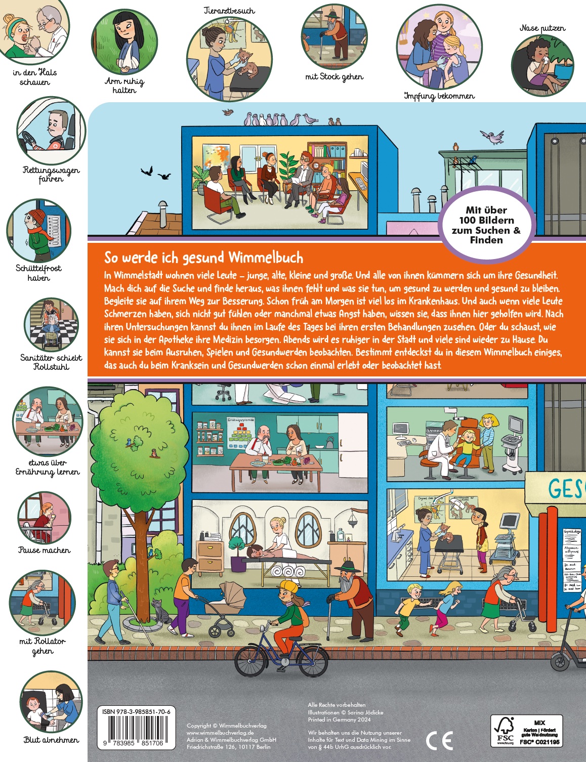 Wer kann mir helfen, wenn es mir mal nicht so gut geht? Wenn ich mir ein Bein breche, komme ich ins Krankenhaus. Aber warum eigentlich noch? Was passiert beim Zahnarzt? Wer impft mich? Wird die nette Kinderärztin wieder meine Größe in meine Karteikarte eintragen? Wozu gibt es Apotheken? Es gibt tausende Fragen, die sich Kinder rund um das Thema Gesundheit stellen. Mit diesem zauberhaft illustrierten Wimmelbuch können Sie zusammen mit ihren Kleinen Fragen erkunden, Ängste nehmen und Antworten finden.