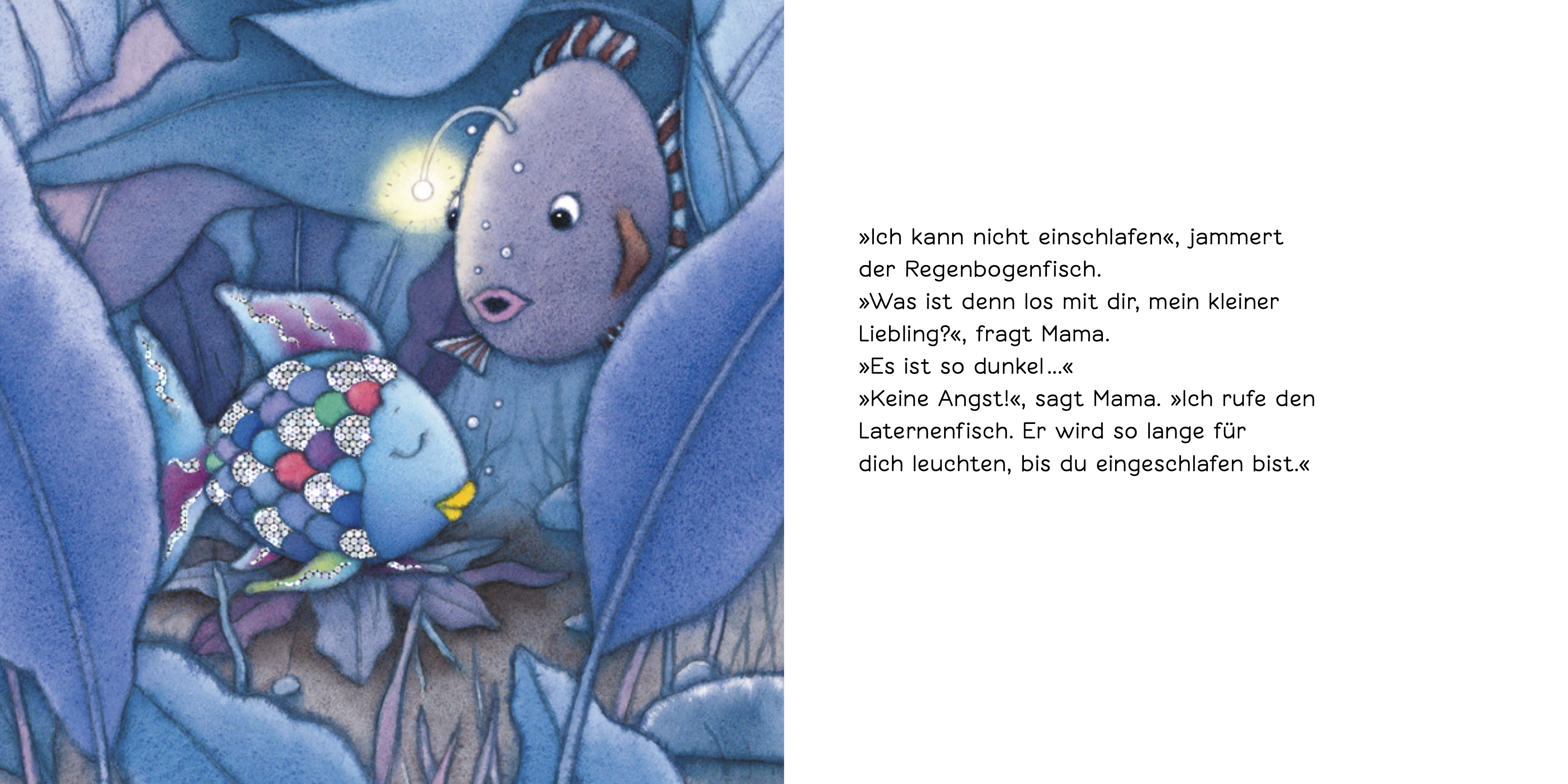 Der kleine Regenbogenfisch kann heute einfach nicht einschlafen. Da hilft nur eins: Mama! Liebevoll verspricht sie dem Kleinen, immer auf ihn aufzupassen - ganz egal, was kommen mag. Pst! Da schlummert der Regenbogenfisch schon friedlich ein ...