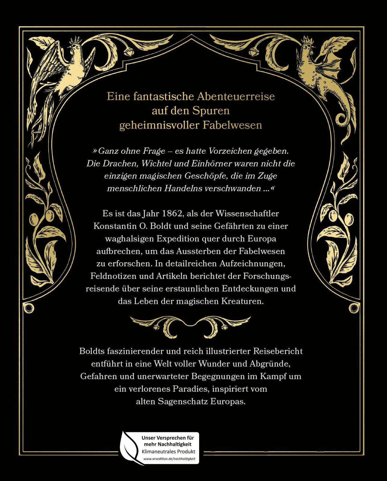 Im Jahre 1862 ruft der Naturforscher Konstantin O. Boldt eine gefahrvolle Expedition ins Leben, um das rätselhafte Verschwinden der Fabeltiere zu erforschen. Sein faszinierender Reisebericht in Tagebuchform entführt dich in die Welt der europäischen Märchen, Sagen und Legenden. In detaillierten Beschreibungen und Illustrationen porträtiert Konstantin O. Boldt zahlreiche mythische Wesen und vergessene Kreaturen. Alte Aufzeichnungen, Feldnotizen und Artikelsammlungen des Naturforschers geben Einblicke in die Lebensweise, das Jagd- und das Fortpflanzungsverhalten der Fabelwesen. Tauche ein in ein fantastisches Abenteuer voller Wunder, Abgründe und Gefahren. Eine spannende Reise voller unerwarteter Begegnungen mit Einhörnern, Phönixen und zahlreichen anderen magischen Tieren!