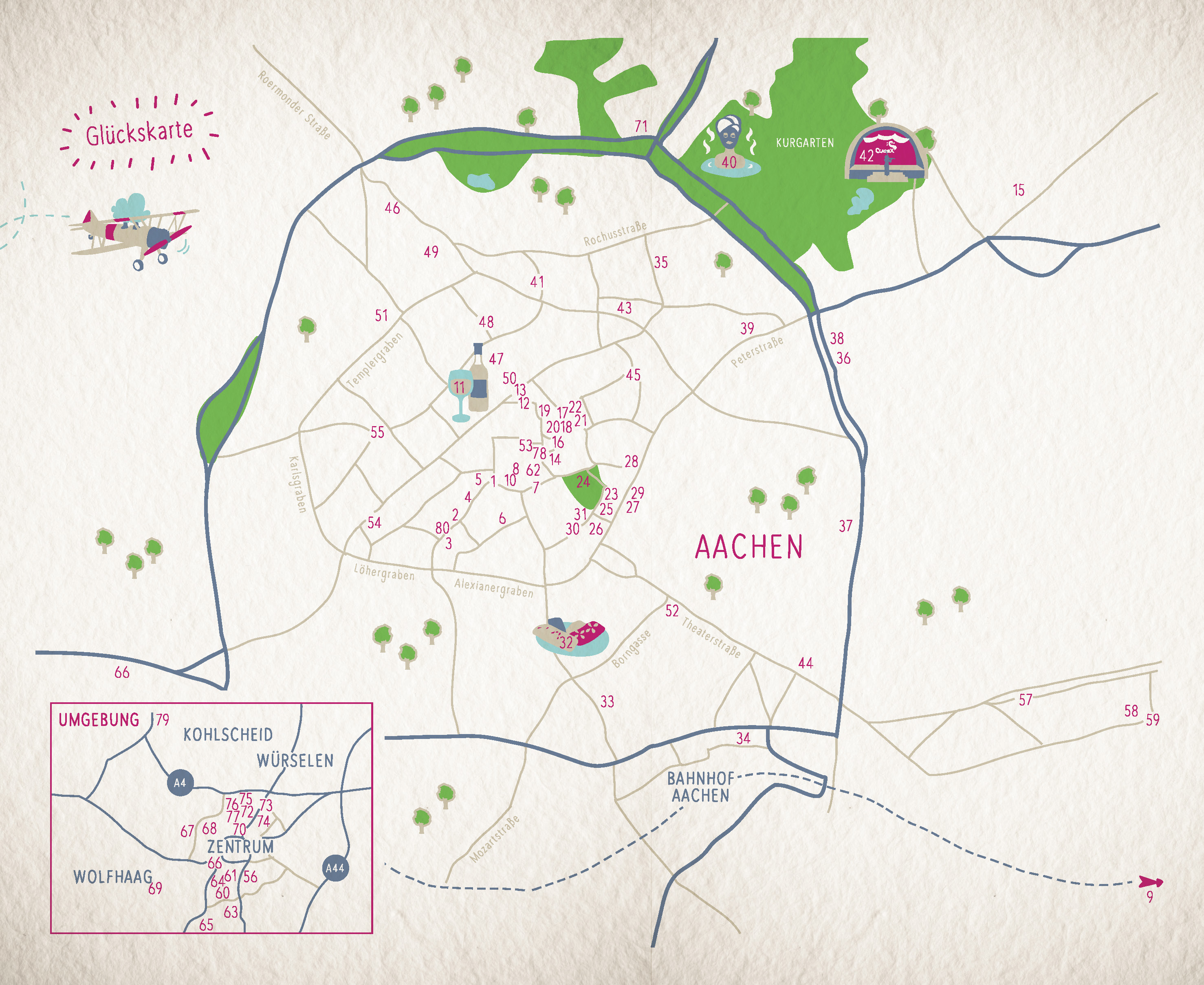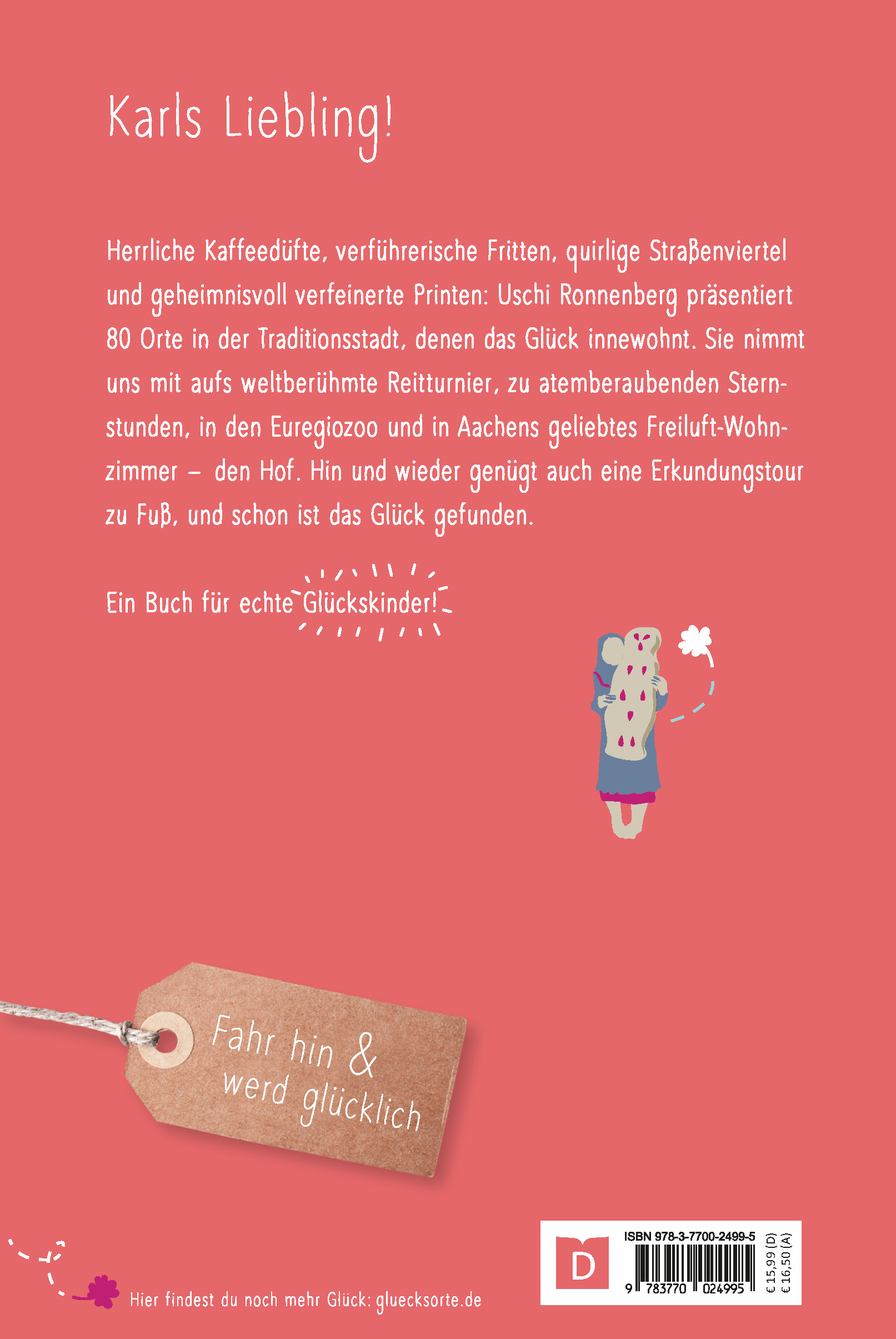 Herrliche Kaffeedüfte, verführerische Fritten, quirlige Straßenviertel und geheimnisvoll verfeinerte Printen: Uschi Ronnenberg präsentiert 80 Orte in der Traditionsstadt, denen das Glück innewohnt. Sie nimmt uns mit aufs weltberühmte Reitturnier, zu atemberaubenden Sternstunden, in den Euregiozoo und in Aachens geliebtes Freiluft-Wohnzimmer - den Hof. Hin und wieder genügt auch eine Erkundungstour zu Fuß, und schon ist das Glück gefunden.