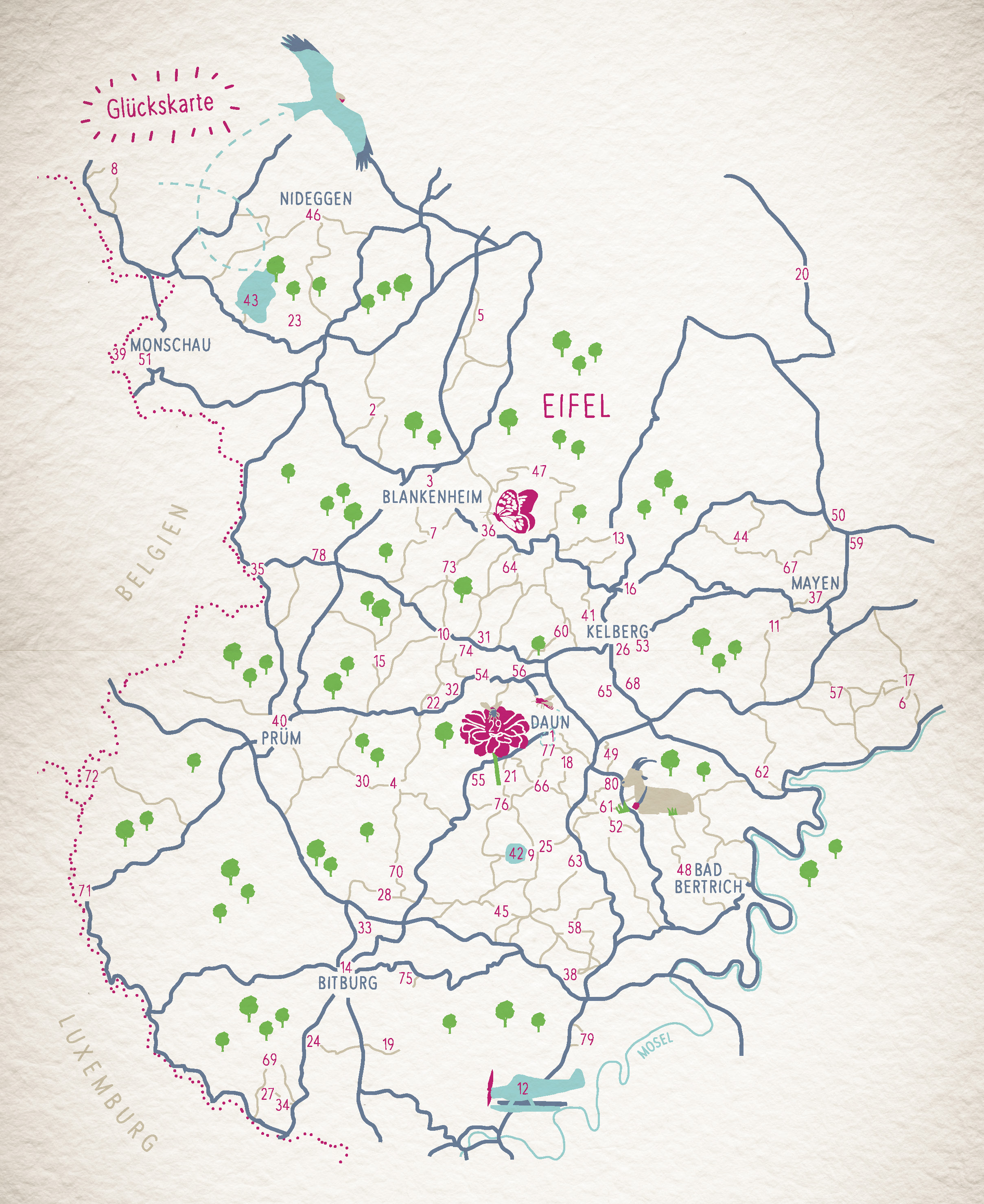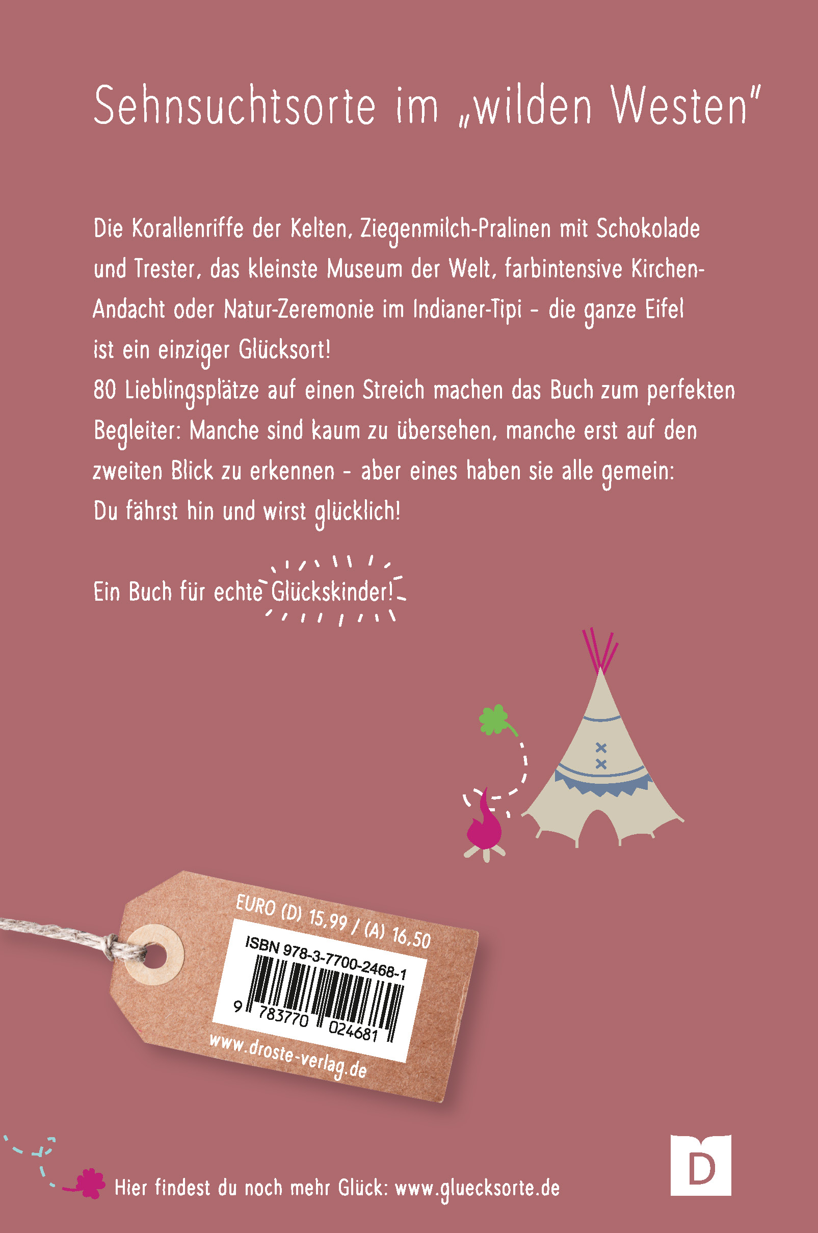Die Korallenriffe der Kelten, Ziegenmilch-Pralinen mit Schokolade und Trester, das kleinste Museum der Welt., farbintensive Kirchen-Andacht oder Natur-Zeremonie im Indianer-Tipi - die ganze Eifel ist ein einziger Glücksort! 80 Lieblingsplätze auf einen Streich machen das Buch zum perfekten Begleiter: Manche sind kaum zu übersehen, manche erst auf den zweiten Blick zu erkennen - aber eines haben sie alle gemein: Du fährst hin und wirst glücklich!