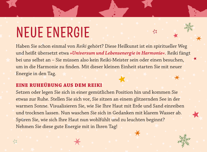 Die kleinen Entspannungsideen, Ruheübungen, Meditationen und vieles mehr helfen Ihnen beim Luftholen, Genießen, Stress reduzieren und regen an, nicht nur in der Adventszeit achtsam mit sich selbst umzugehen.