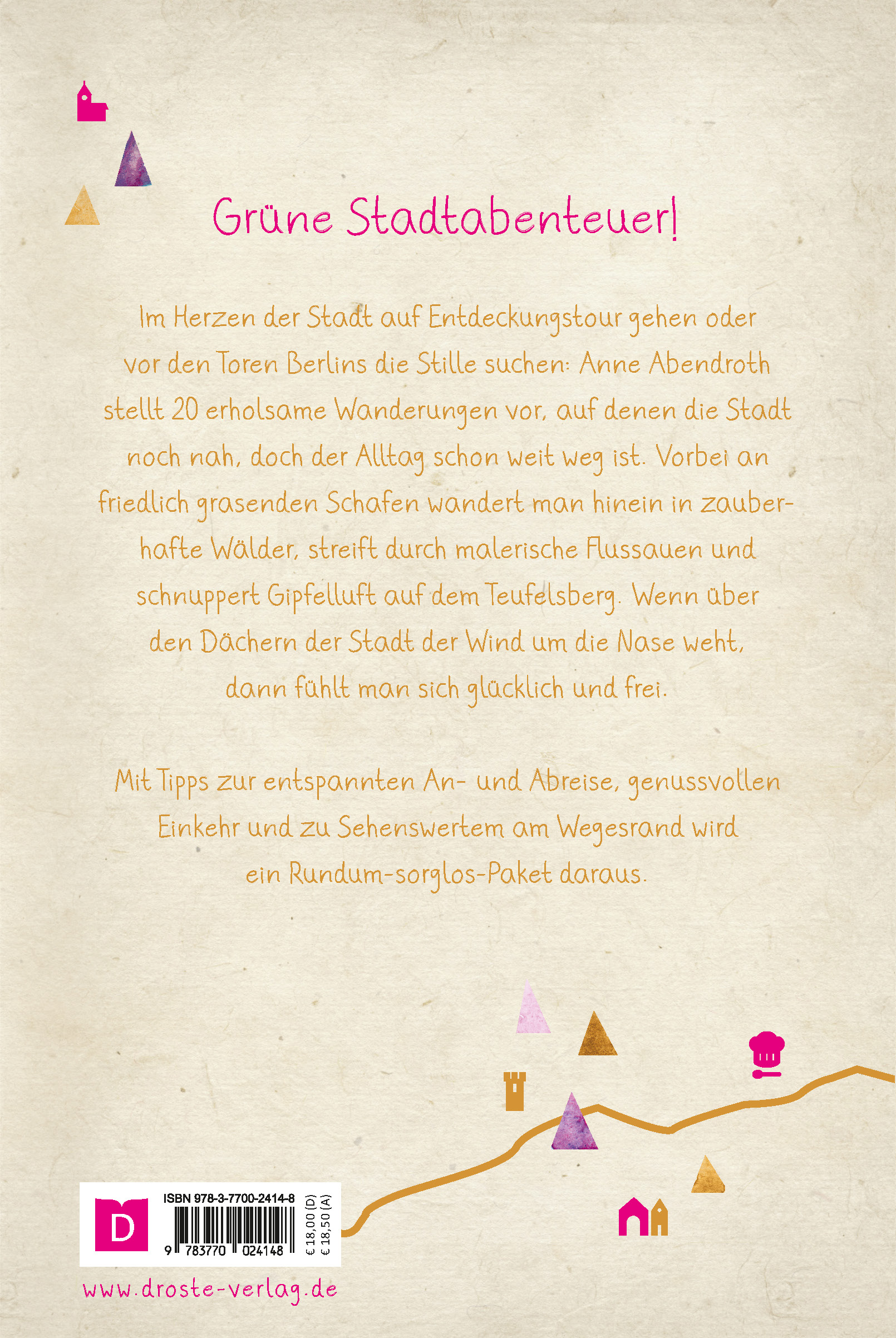 Im Herzen der Stadt auf Entdeckungstour gehen oder vor den Toren Berlins die Stille suchen: Anne Abendroth stellt 20 erholsame Wanderungen vor, auf denen die Stadt noch nah, doch der Alltag schon weit weg ist. Vorbei an friedlich grasenden Schafen wandert man hinein in zauberhafte Wälder, streift durch malerische Flussauen und schnuppert Gipfelluft auf dem Teufelsberg. Wenn über den Dächern der Stadt der Wind um die Nase weht, dann fühlt man sich glücklich und frei.