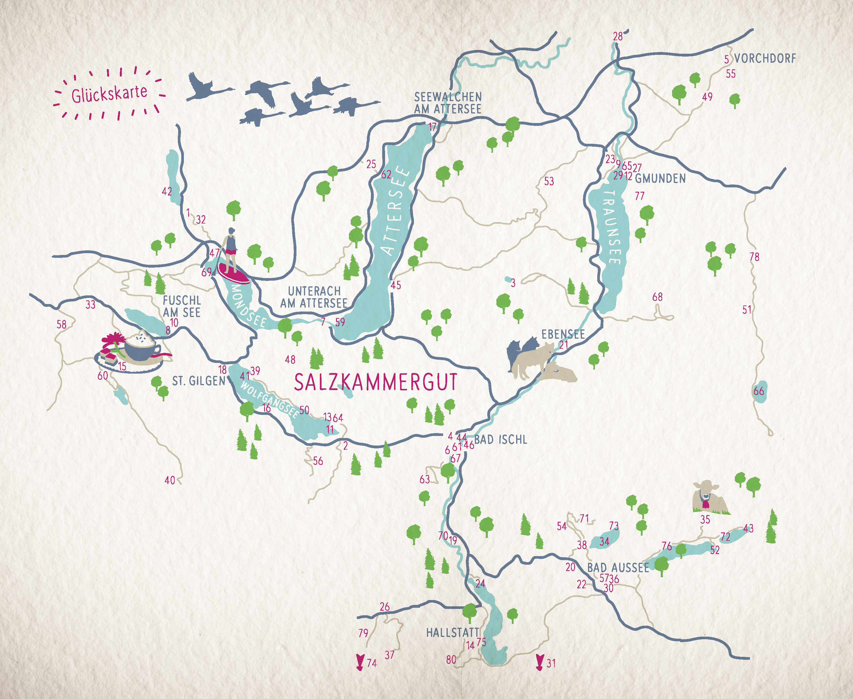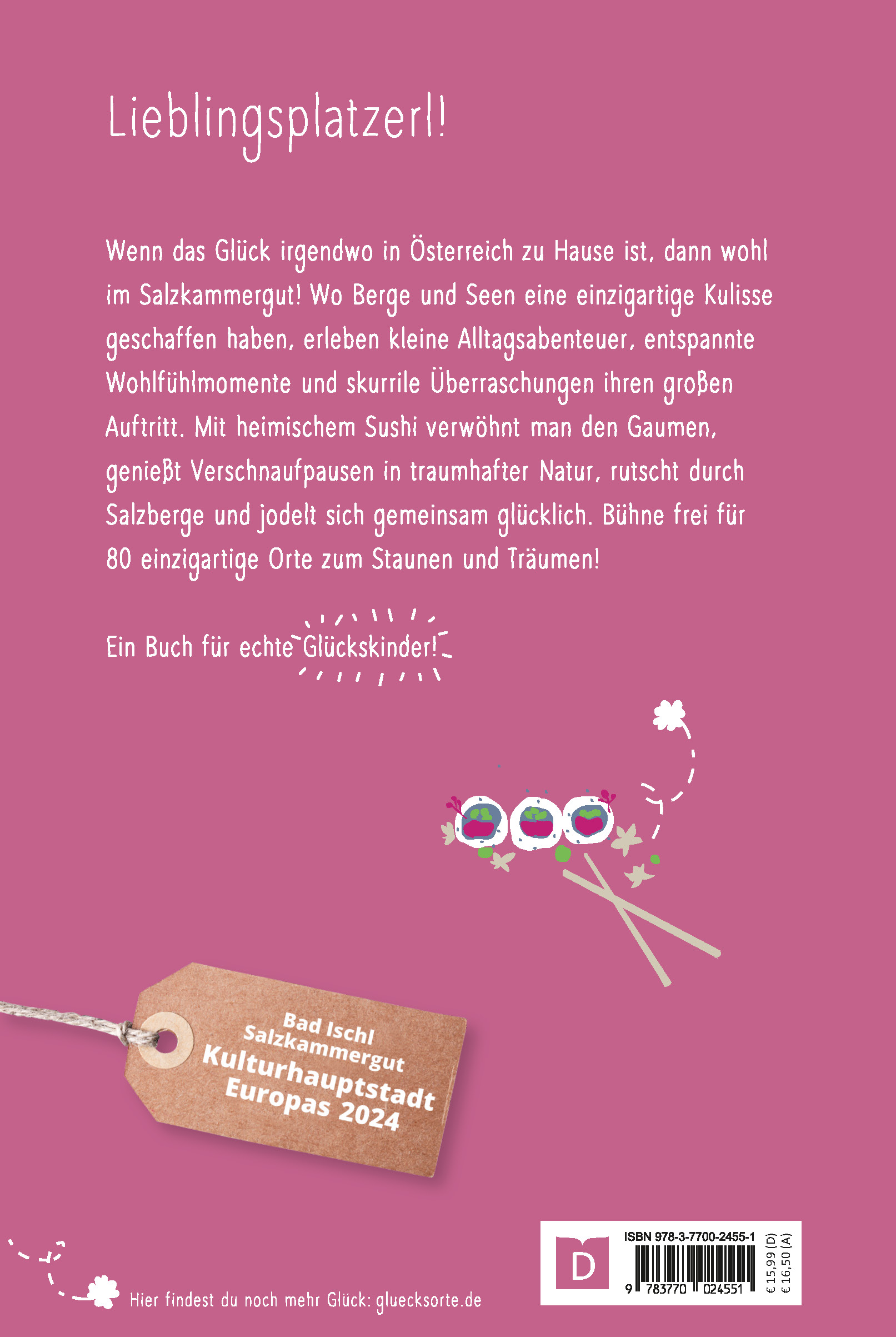 Wenn das Glück irgendwo in Österreich zu Hause ist, dann wohl im Salzkammergut. Wo Berge und Seen eine einzigartige Kulisse geschaffen haben, erleben kleine Alltagsabenteuer, entspannte Wohlfühlmomente und skurrile Überraschungen ihren großen Auftritt. Mit heimischem Sushi verwöhnt man den Gaumen, genießt kleine Verschnaufpausen in traumhafter Natur, rutscht durch Salzberge und jodelt sich gemeinsam glücklich. Bühne frei für 80 einzigartige Orte zum Staunen und Träumen!