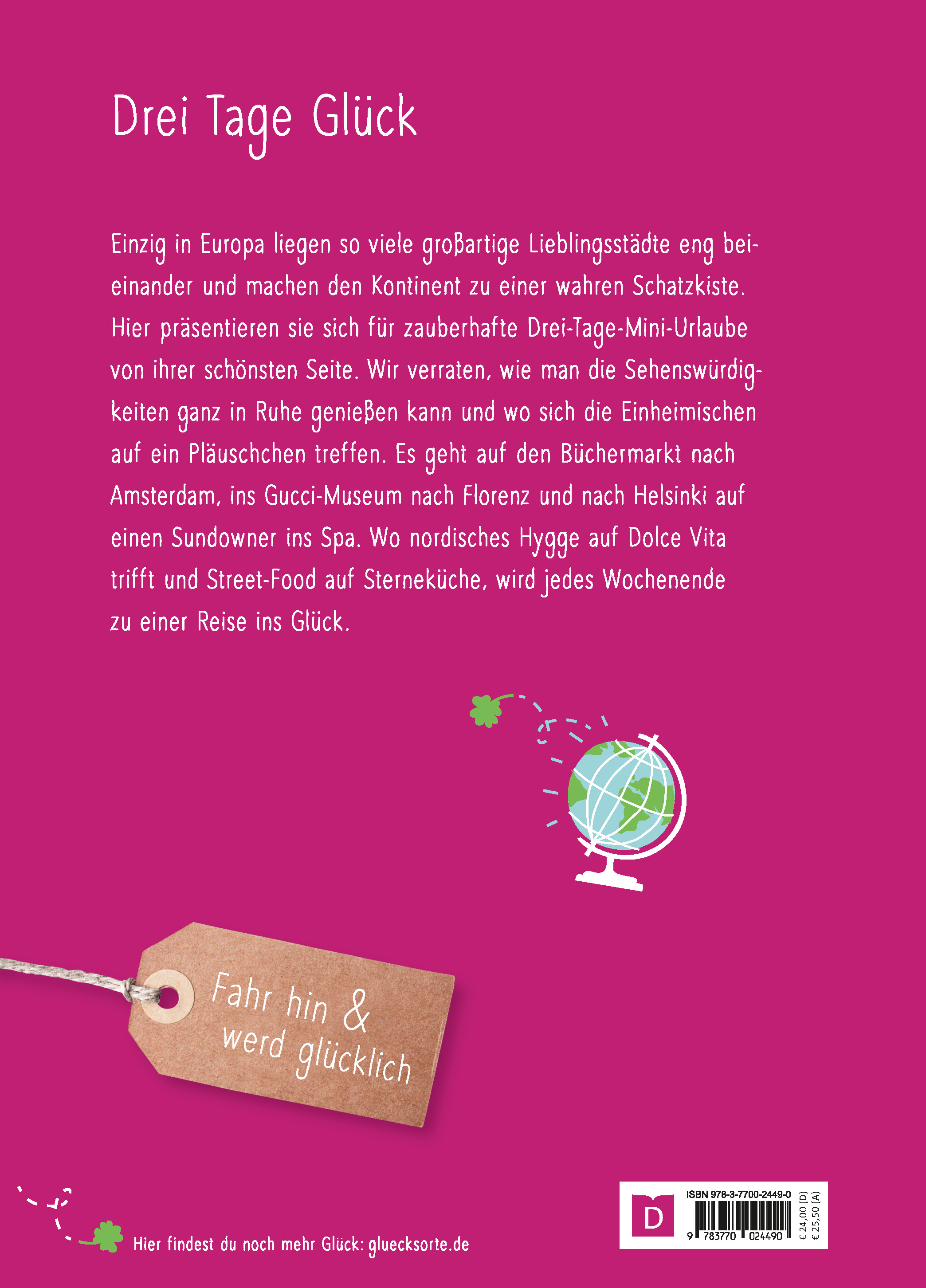 Einzig in Europa liegen so viele großartige Lieblingsstädte eng beieinander und machen den Kontinent zu einer wahren Schatzkiste. Hier präsentieren sie sich für zauberhafte Drei-Tage-Mini-Urlaube von ihrer schönsten Seite. Wir verraten, wie man die Sehenswürdigkeiten ganz in Ruhe genießen kann und wo sich die Einheimischen auf ein Pläuschen treffen. Es geht auf den Büchermarkt nach Amsterdam, ins Gucci-Museum nach Florenz und nach Helsinki auf einen Sundowner ins Spa. Wo nordisches Hygge auf Dolce Vita trifft und Street-Food auf Sterne-Küche, wird jedes Wochenende zu einer Reise ins Glück.