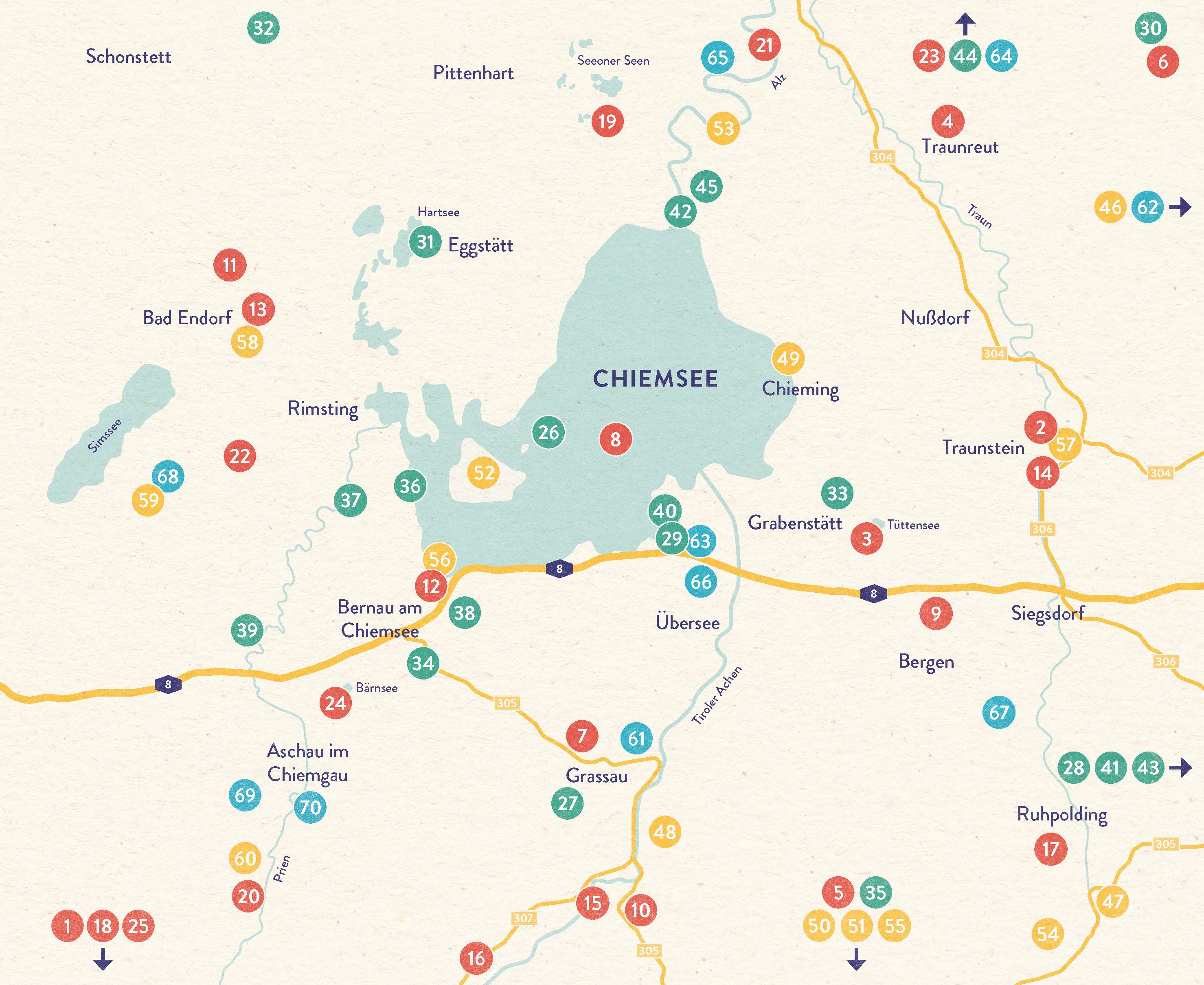 Zeit für sich selbst nehmen und Energie tanken - im Chiemgau geht das ganz wunderbar! Zwischen Rosenheim und Traunstein liegt ein wahres Erholungsparadies. Entschleunigung für die Seele findet sich im fernöstlichen Wellnessgarten und den Chiemgauer Thermen, während eine leckere Brotzeit im Wiggerl17 den Körper stärkt. Von der Beautybehandlung über eine Fahrradtour durchs Priental bis zum Wochenende im Yoga-Retreat: 70 Orte laden zu kleinen und großen Pausen vom Alltag ein.