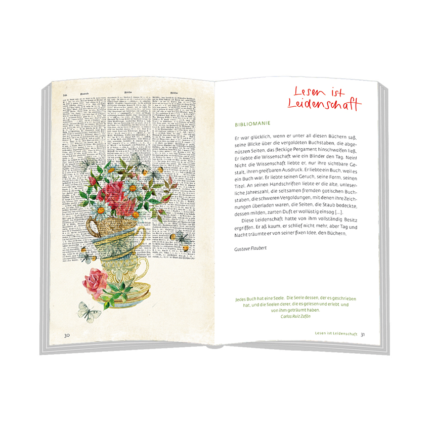 Vom Glück und von der Leidenschaft, Bücher zu lieben, erzählen ausgewählte Texte aus weltbekannten Werken von Michael Ende, Cornelia Funke, Carlos Ruiz Zafón, Umberto Eco, Michel de Montaigne,Rainer Maria Rilke, Gustave Flaubert u.a.. Ausgestattet mit originellen Collagebildern aus historischen Lese- und Wörterbüchern eine treffende Geschenkidee für Leseratten, Buchliebhaberund alle, die wissen wollen, wie sich aus Büchern für das eigene Leben schöpfen lässt.