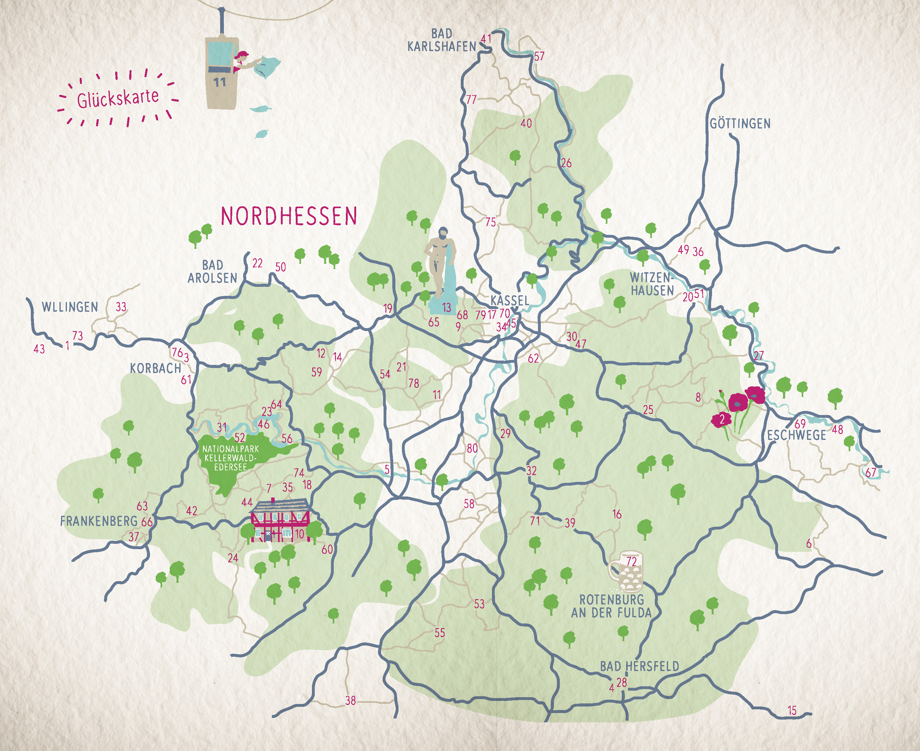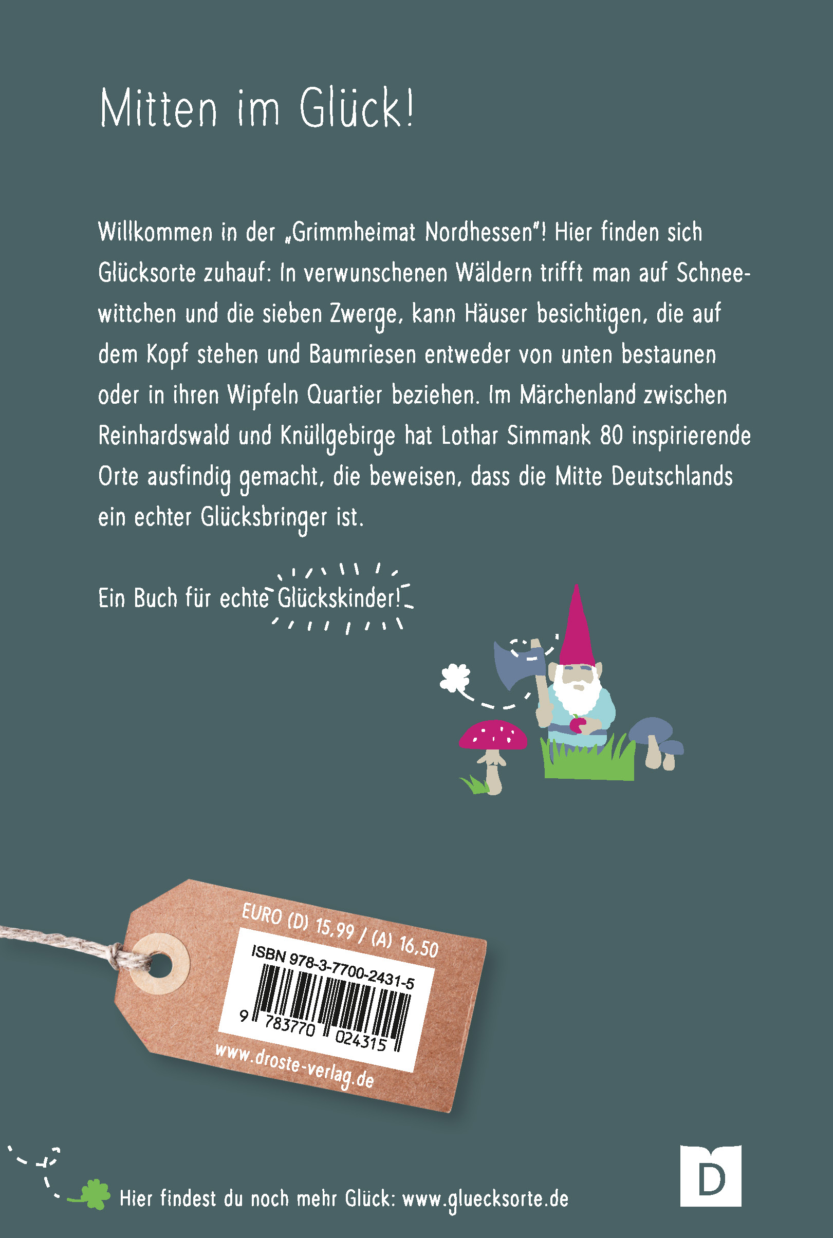 Willkommen in der "Grimmheimat Nordhessen"! Hier finden sich Glücksorte zuhauf: In verwunschenen Wäldern trifft man auf Schneewittchen und die sieben Zwerge, kann Häuser besichtigen, die auf dem Kopf stehen und Baumriesen entweder von unten bestaunen oder in ihren Wipfeln Quartier beziehen. Im Märchenland zwischen Reinhardswald und Knüllgebirge hat Lothar Simmank 80 inspirierende Orte ausfindig gemacht, die beweisen, dass die Mitte Deutschlands ein echter Glücksbringer ist.