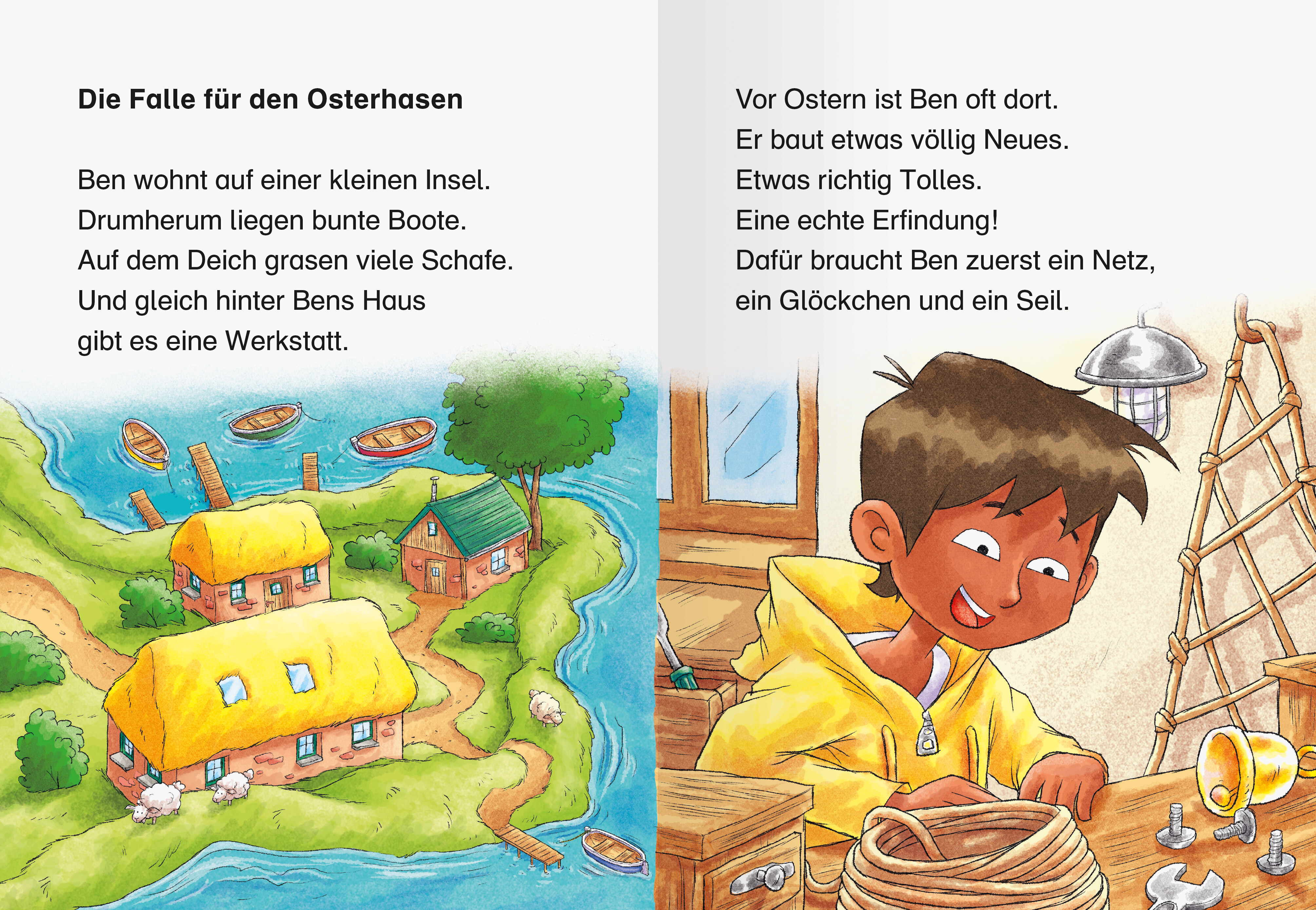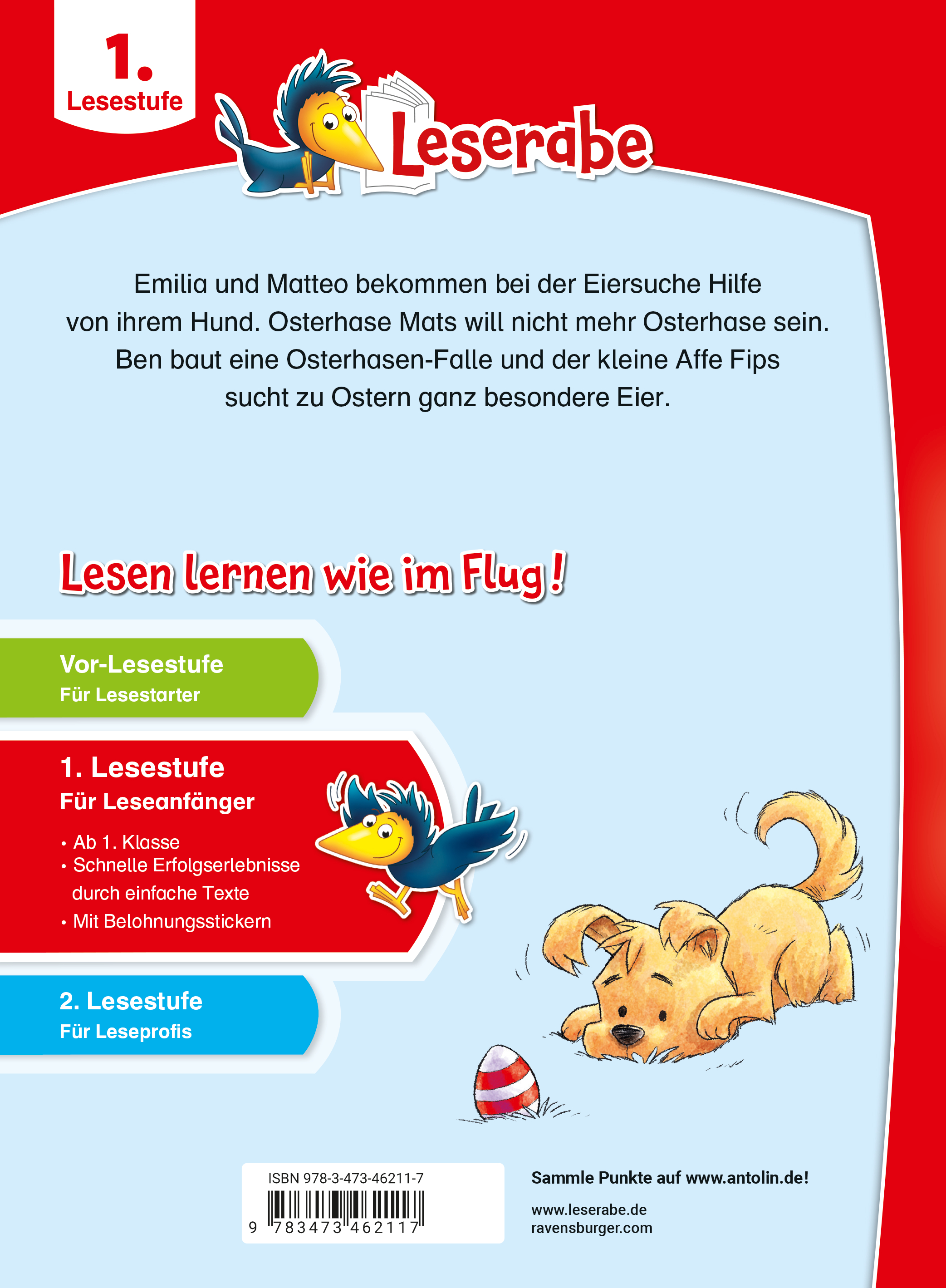 Ob der Osterhase schon da war? Emilia und Matteo bekommen bei der Eier-Suche Hilfe von ihrem Hund. Osterhase Mats will nicht mehr Osterhase sein. Ben baut eine Osterhasen-Falle und der kleine Affe Fips sucht zu Ostern ganz besondere Eier. Vier lustige Ostergeschichten für Leseanfänger.