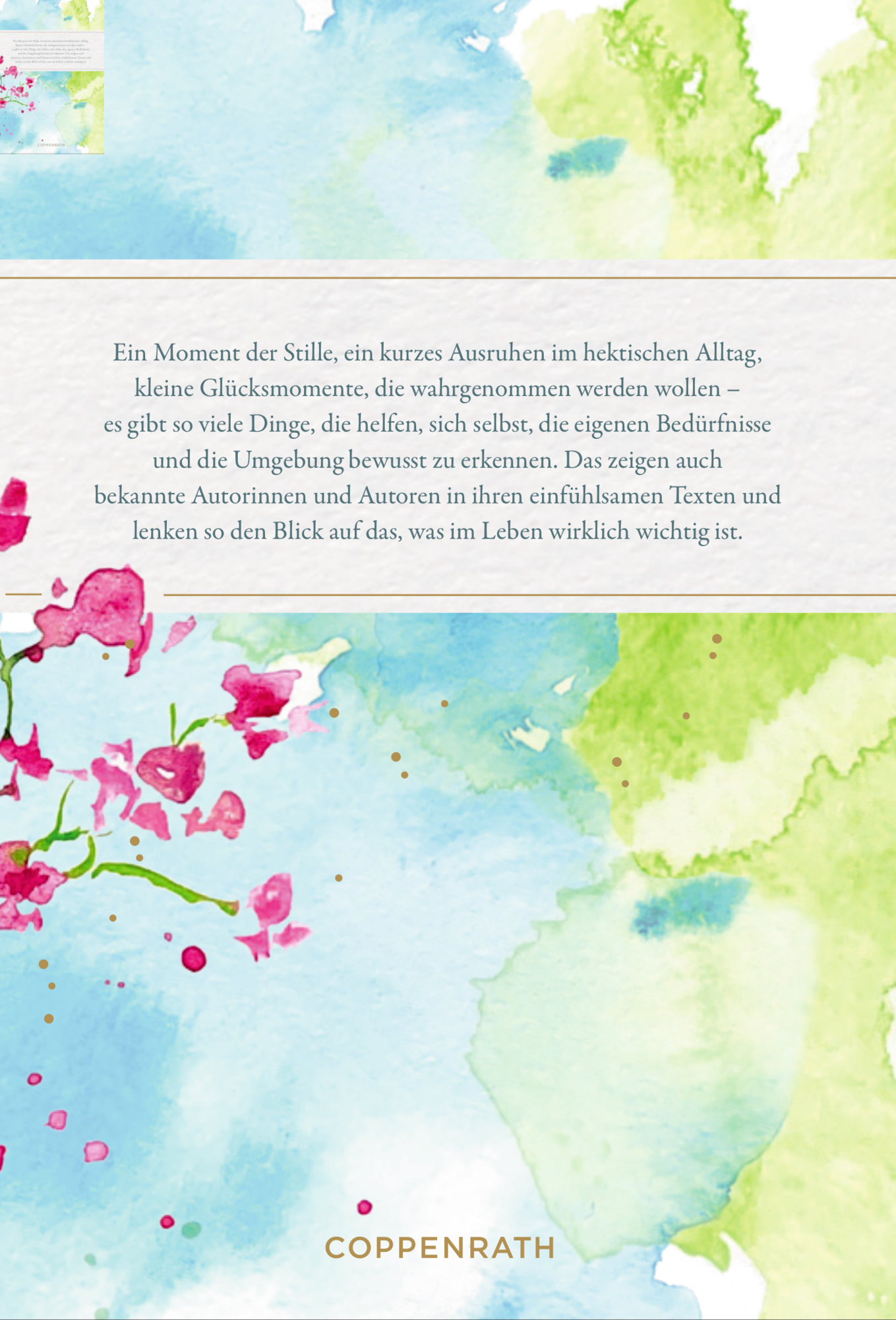 Ein Moment der Stille, ein kurzes Ausruhen im hektischen Alltag, kleine Glücksmomente, die darauf warten, wahrgenommen zu werden - es gibt so viele Dinge, die helfen, sich selbst, die eigenen Bedürfnisse und die Umwelt bewusst zu erkennen. Das zeigen auch bekannte Autorinnen und Autoren in ihren einfühlsamen Texten. Ob bei einer Pause von der Arbeit, in einer ruhigen Minute zu Hause oder einfach nur so: Dieses Buch schärft den Blick für die Dinge, die in unserem Leben wichtig sind - ein wundervolles Geschenk zu vielen Anlässen!