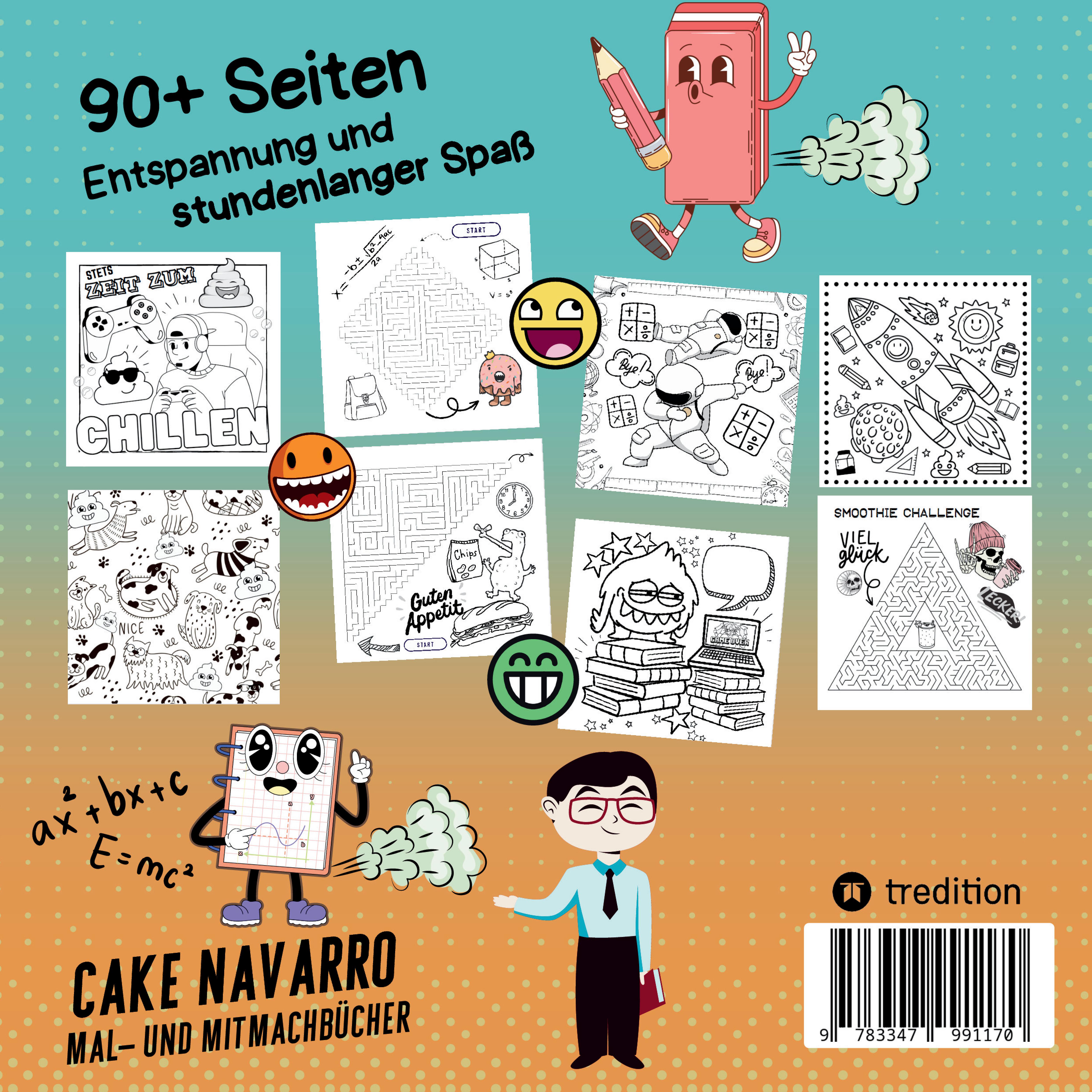 Ein lustiges Mitmachbuch besonders für clevere Jungen. Entspannt und fördert Kreativität und Gehirntraining. Über 90 Seiten mit Labyrinthen, schrägen Ausmalbildern, Cartoons, Wimmelbildern, Fehler finden und mehr. Ideal für die Pause zwischendurch, z.B. in der Ferienzeit, über die Feiertage, zum Schulanfang, unterwegs im Auto oder Zug, im WartezimmerDetails zum Buch: ++ Qualität Made in Germany, mit umweltfreundlichen Ressourcen++ Über 90 Seiten mit Labyrinthen, Doodles, Wimmelbildern, Fehler finden und mehr++ Positive Motive rund um Schule trifft Kack-Emojis, Hunde, Fast Food, Autos, Zocken, Weltall, Piraten, Ungeheuer und mehr. Als Geschenk oder Mitbringsel für Kinder 8-12 Jahre geeignet. Weitere Titel von Cake Navarro Kids entdecken.
