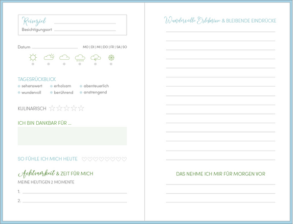 Ein Tagebuch zum Ankreuzen und Ausfüllen damit Du Deinen Urlaub optimal planen und in nur 5 Minuten deine Erlebnisse festhalten kannst.