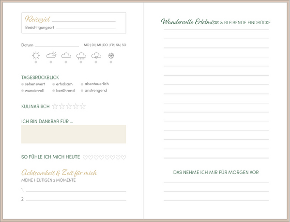 Ein Tagebuch zum Ankreuzen und Ausfüllen damit Du Deinen Urlaub optimal planen und in nur 5 Minuten deine Erlebnisse festhalten kannst.