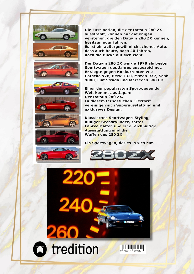 280 ZX - Legende der 80er Jahre im 133-seitigen Hardcover-DIN A4-Format mit ca. 260 Fotos auf 81 Farbseiten.Einer der populärsten Sportwagen der Welt kommt aus Japan: Der Datsun 280 ZX.Er gehört zur erfolgreichsten Sportwagenreihe aller Zeiten (1,65 Millionen verkaufte Exemplare). In diesem fernöstlichen "Ferrari" vereinigen sich Superausstattung und exklusives Design.Klassisches Sportwagen-Styling, bulliger Sechszylinder, sattes Fahrverhalten und reichhaltige Ausstattung sind die Waffen des 280 ZX.Der Datsun 280 ZX wird 1978 als bester Sportwagen des Jahres ausgezeichnet. Er siegte gegen Konkurrenten wie Porsche 928, BMW 733i, Mazda RX7, Saab 9000, Fiat Strada und Mercedes 300 CD.Die Faszination, die der Datsun 280 ZX ausstrahlt, können nur diejenigen verstehen, die den Datsun 280 ZX kennen, besitzen oder fahren.Es ist ein außergewöhnlich schönes Auto, dass auch heute, nach 40 Jahren, noch bewundernde Blicke auf sich zieht.