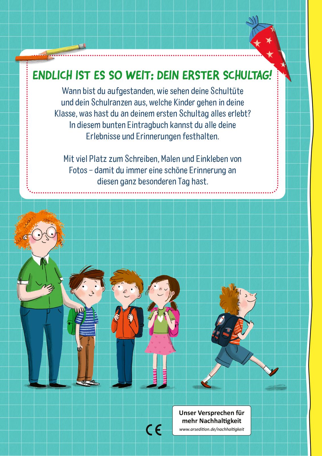 Und damit der erste Schultag nie in Vergessenheit gerät, können in diesem bunten Eintragbuch die schönsten und wichtigsten Momente als frischgebackenes Schulkind festgehalten werden: Wie sieht deine Schultüte aus? Wer geht in deine Klasse? Welche Buchstaben kennst du schon?