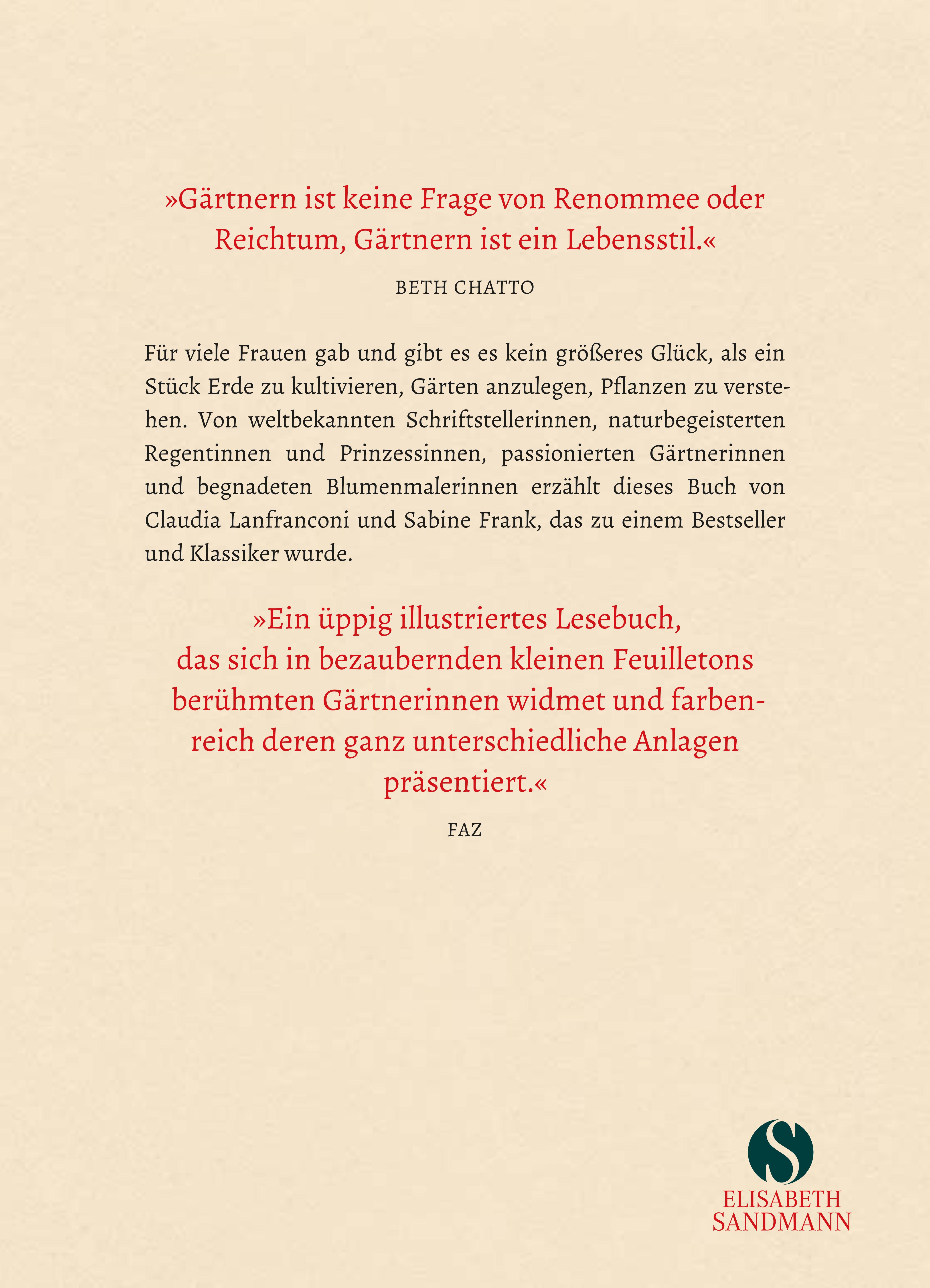 »Ein üppig illustriertes Lesebuch, das sich in bezaubernden kleinen Feuilletons berühmten Gärtnerinnen widmet und farbenreich deren ganz unterschiedliche Anlagen präsentiert.« Frankfurter Allgemeine Zeitung