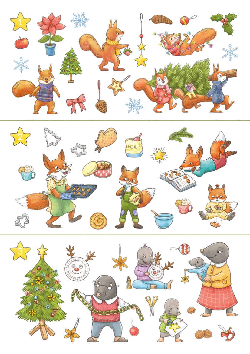 Der Stickeralbum-Adventskalender: Tiere - für die Kleinsten. Nicht nur die Tiere des Waldes bereiten sich auf Weihnachten vor, auch in der Arktis oder Skandinavien begehen die Tiere den Advent. Für jeden Tag im Advent enthält das Heft eine zauberhafte Winter- und Weihnachtsszenen im Lebensraum, den Behausungen und den weihnachtlichen Orten von Tieren sowie die dazu passenden Sticker zum Gestalten. Auf die Sticker, fertig – klebt!
