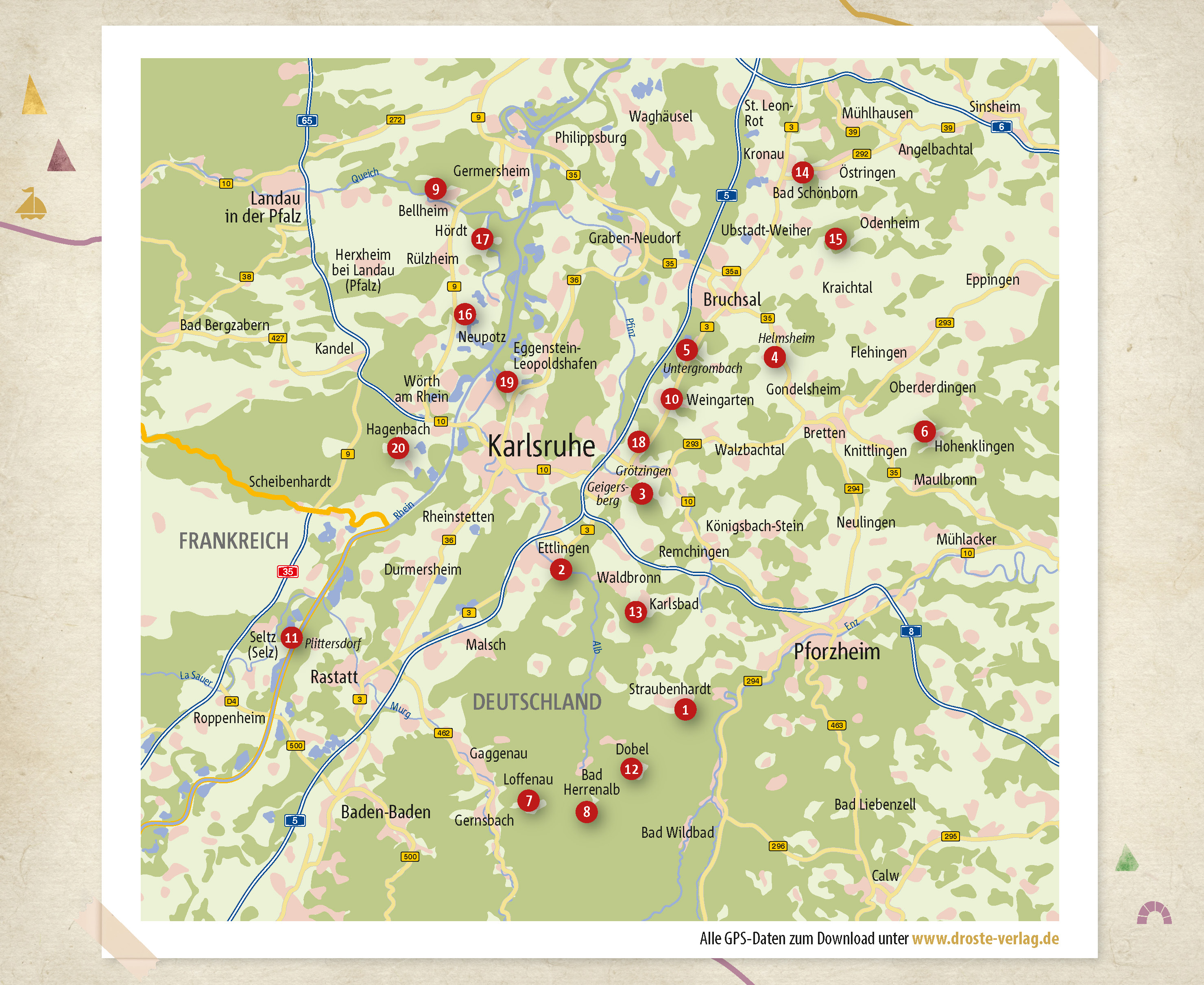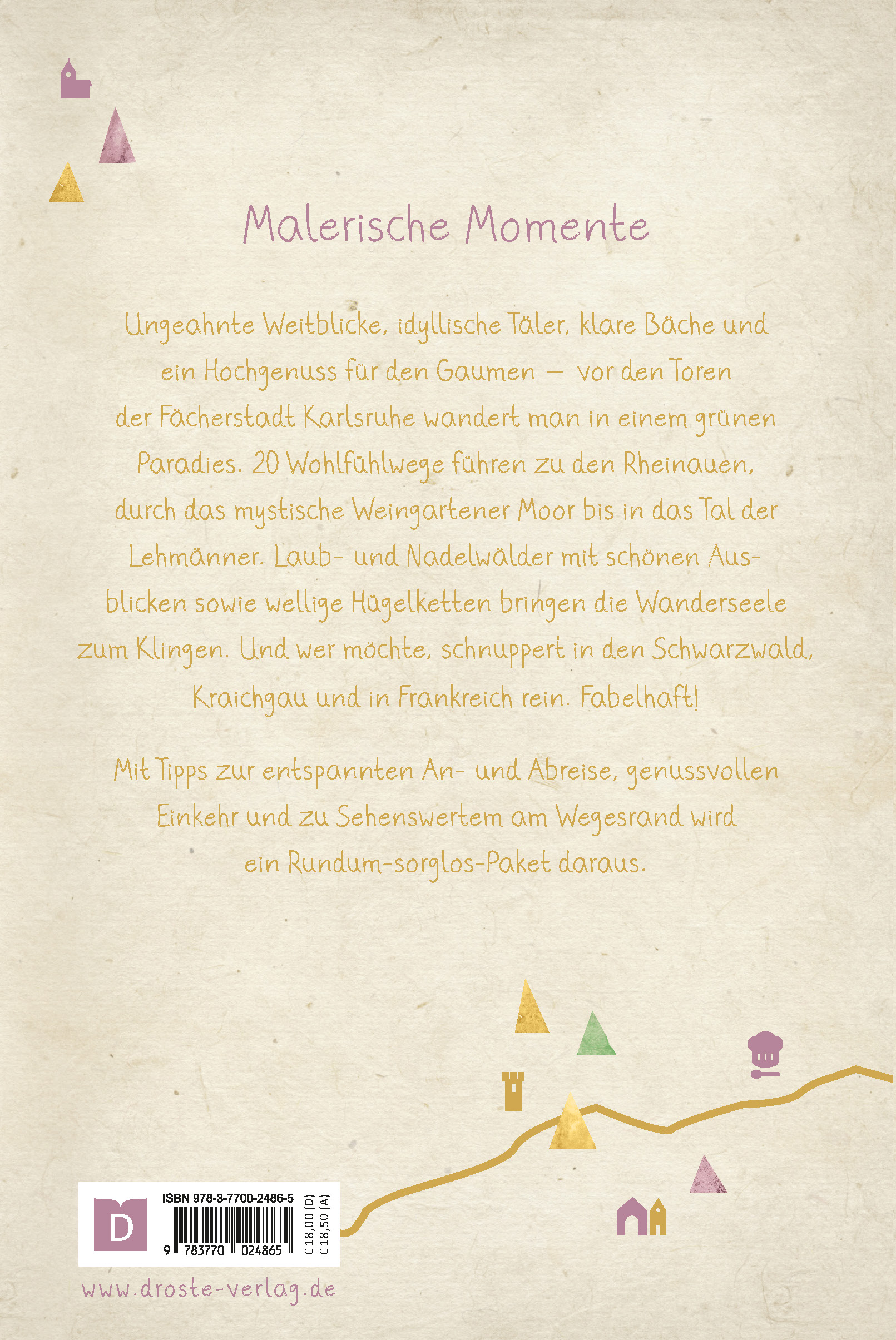 Ungeahnte Weitblicke, idyllische Täler, klare Bäche und ein Hochgenuss für den Gaumen - vor den Toren der Fächerstadt Karlsruhe wandert man in einem grünen Paradies. 20 Wohlfühlwege führen zu den Rheinauen, durch das mystische Weingartener Moor bis in das Tal der Lehmänner. Laub- und Nadelwälder mit schönen Ausblicken sowie wellige Hügelketten bringen die Wanderseele zum Klingen. Und wer möchte, schnuppert in den Schwarzwald, Kraichgau und in Frankreich rein. Fabelhaft!
