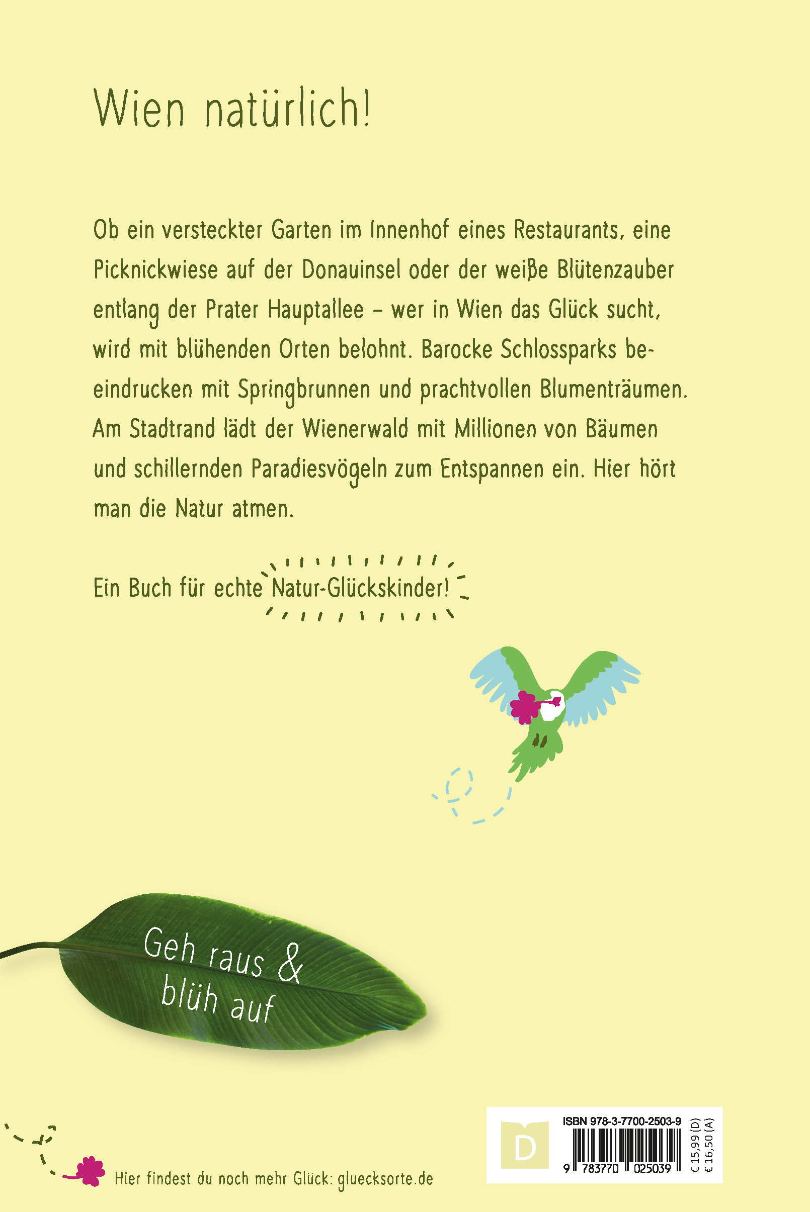 Ob ein versteckter Garten im Innenhof eines Restaurants, eine Picknickwiese auf der Donauinsel oder der weiße Blütenzauber entlang der Prater Hauptallee - wer in Wien das Glück sucht, wird mit blühenden Orten belohnt. Barocke Schlossparks beeindrucken mit Springbrunnen und prachtvollen Blumenträumen. Am Stadtrand lädt der Wienerwald mit Millionen von Bäumen und schillernden Paradiesvögeln zum Entspannen ein. Hier hört man die Natur atmen.