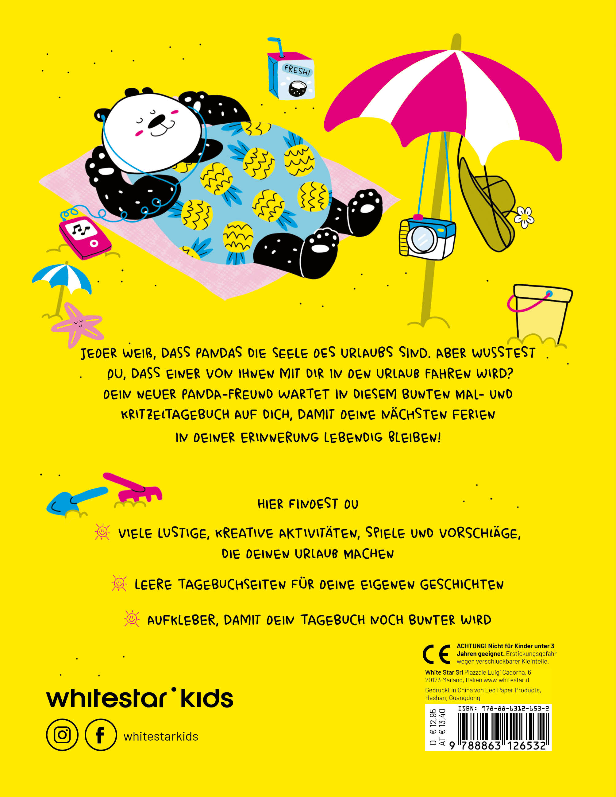 In diesem genial gestalteten Reisetagebuch kannst du deine Ferienerlebnisse aufschreiben, einkleben oder zeichnen. Dein kleiner Reisebegleiter ist ein niedlicher Panda, der dich dazu inspirieren möchte, deiner Kreativität freien Lauf zu lassen: Beantworte spannende Fragen, bringe deine Beobachtungen zu Papier oder erkunde unbekannte Orte. Was war die interessanteste Sache, der du begegnet bist? Wie war das Wetter? Was möchtest du für deine Reise einpacken? Neben Check-Listen und kleinen Quizspielen gibt es genug Platz, den du ganz individuell gestalten kannst: mit gefundenen Schätzen, Eintrittskarten oder den Rezepten deiner Urlaubslieblingsspeisen.