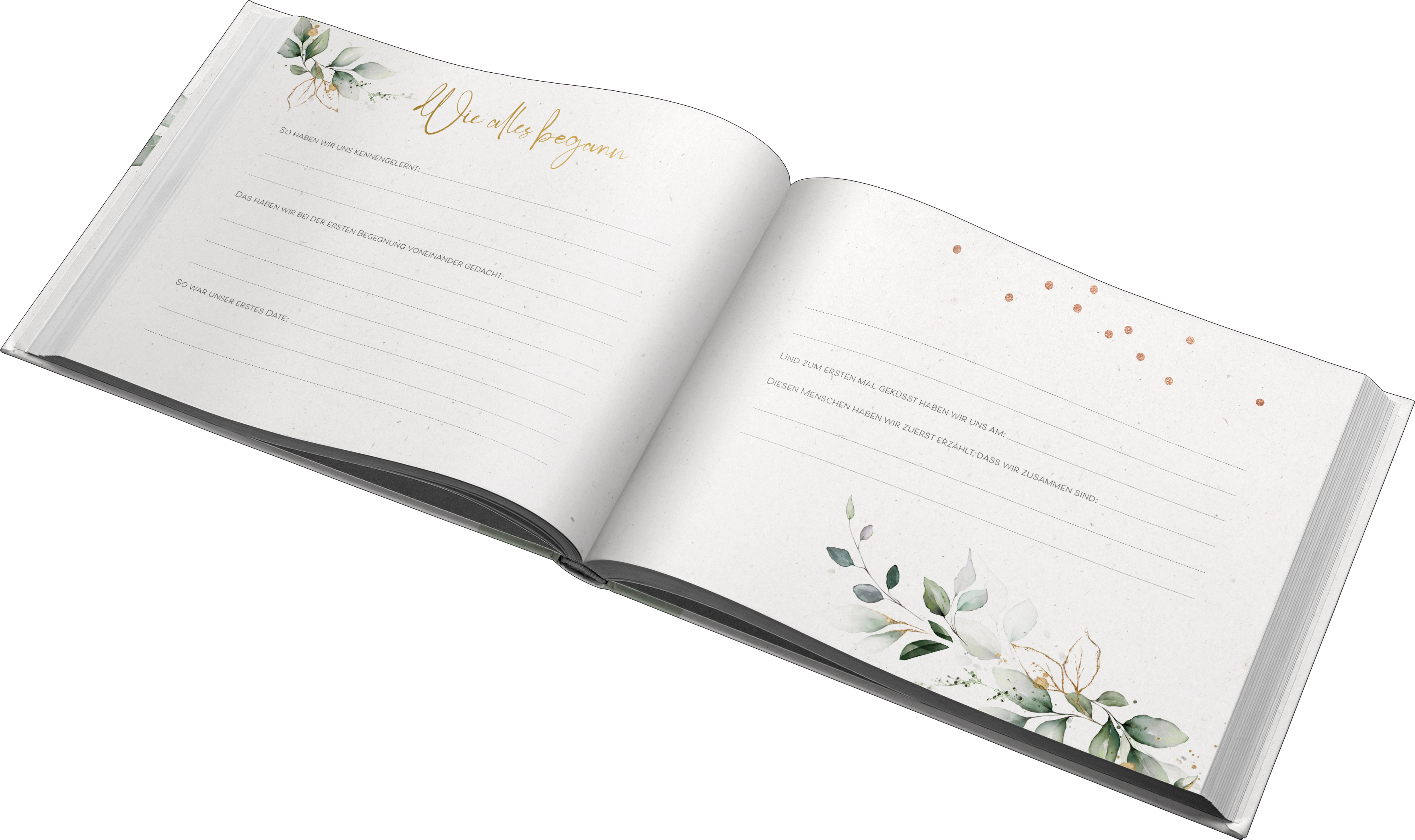 Viel Platz für die persönliche Gestaltung: Das erste Kennenlernen, der Trauspruch, die Einladungskarte, das Menü oder die Wünsche der Gäste – zahlreiche Eintrageseiten laden dazu ein, alles Wichtige festzuhalten. Daneben gibt es ausreichend Platz für die schönsten Fotos. Ergänzt wird das Album durch sorgfältig ausgewählte Zitate, die das Brautpaar auf seinem Weg begleiten.