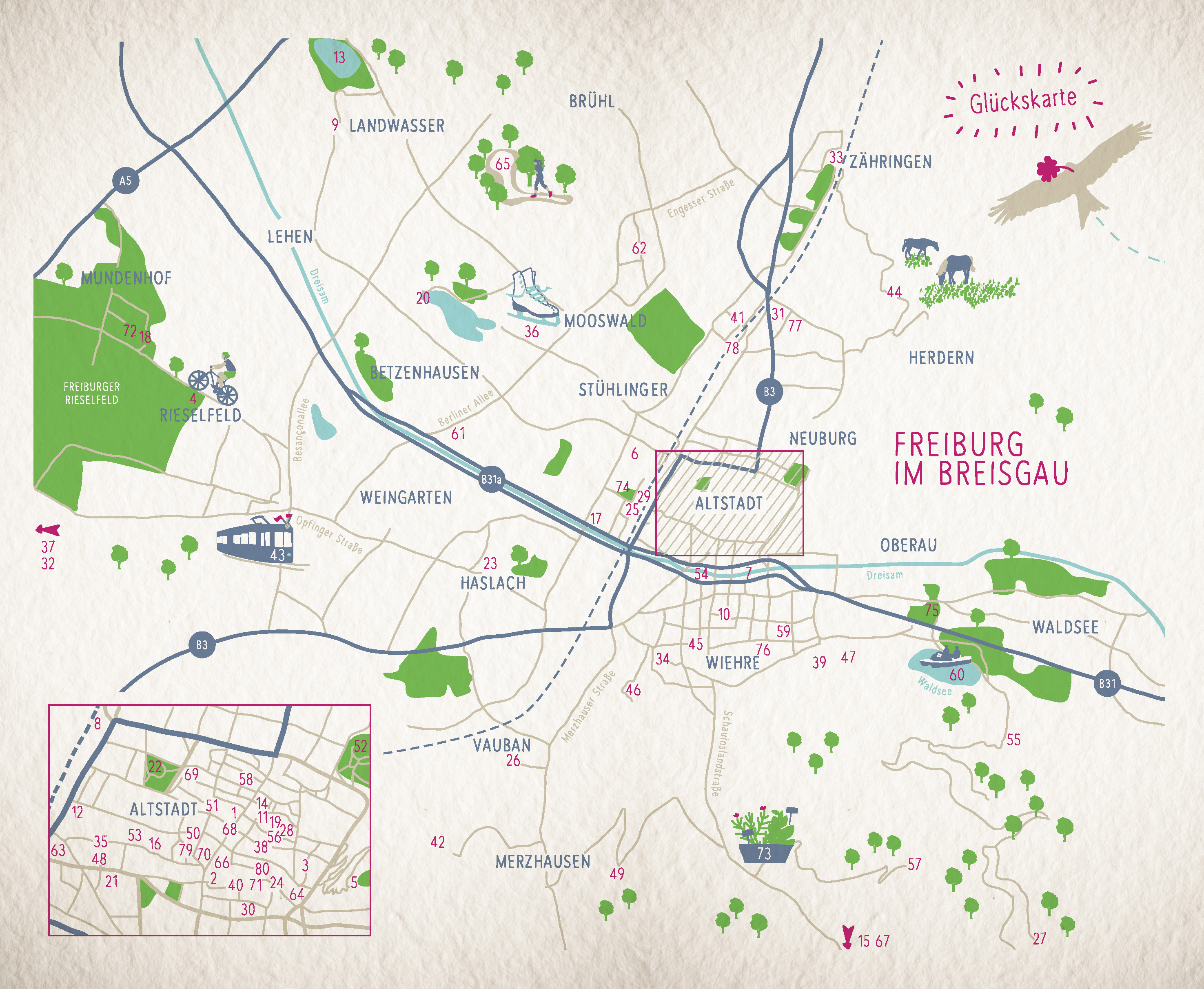 Freiburg ist eine wahre Glücksstadt! Die Autorinnen Kathrin Blum und Silke Kohlmann wussten das schon immer und stellen hier ihre 80 Highlights zusammen: Das Glück kommt für sie auf Kuchengabeln daher, schwebt in einer Seilbahn oder wankt auch mal durch eine Partystraßenbahn. Und eines steht fest: Nirgendwo sonst lässt sich ein Sonnenuntergang so schön genießen wie auf dem Freiburger Schlossberg.
