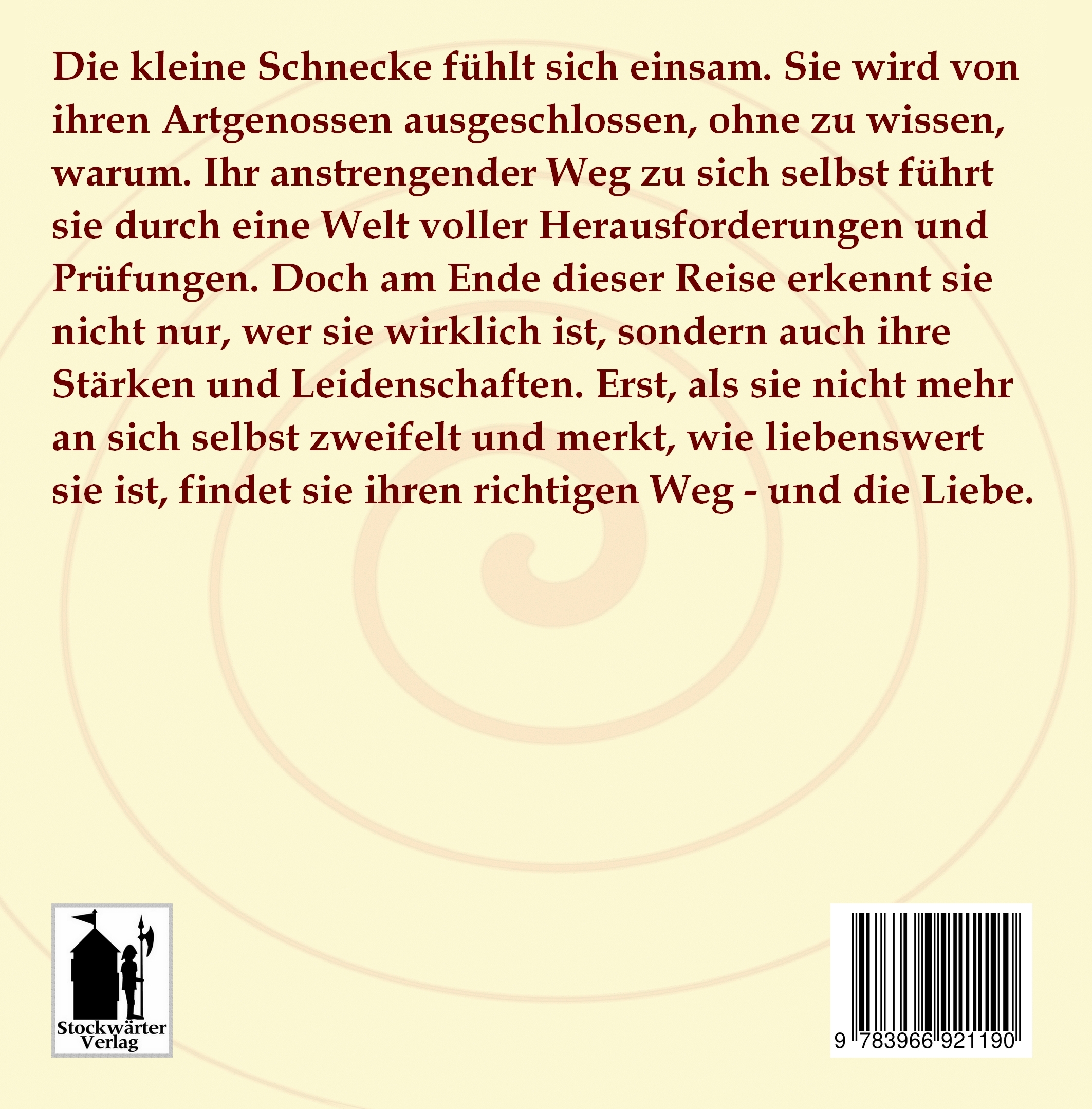 Die kleine Schnecke fühlt sich einsam. Sie wird von ihren Artgenossen ausgeschlossen, ohne zu wissen, warum. Ihr anstrengender Weg zu sich selbst führt sie durch eine Welt voller Herausforderungen und Prüfungen. Doch am Ende dieser Reise erkennt sie nicht nur, wer sie wirklich ist, sondern auch ihre Stärken und Leidenschaften. Erst, als sie nicht mehr an sich selbst zweifelt und merkt, wie liebenswert sie ist, findet sie ihren richtigen