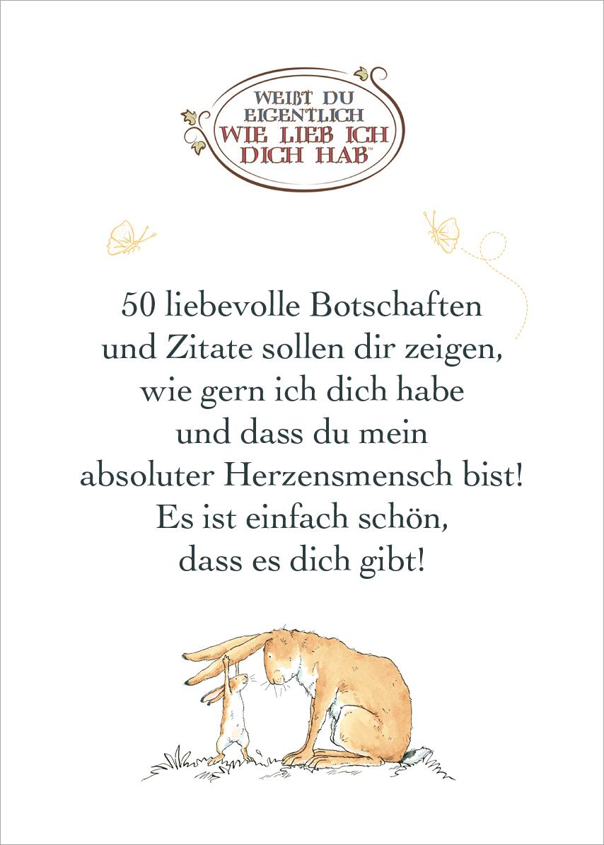Der weltbekannte Kinderbuchklassiker "Weißt du eigentlich, wie lieb ich dich hab?" hat Millionen von Menschen verzaubert. Geschrieben von Sam McBratney und liebevoll illustriert von Anita Jeram vermittelt die Geschichte des kleinen und des großen Hasen Werte wie Zusammengehörigkeit, Liebe und Geborgenheit. Dieser Klassiker bietet hier die Bühne für ein liebevolles Geschenk für alle Herzensmenschen. Ob für den liebsten Schatz, die beste Freundin oder die Mama - diese Kartenbox zaubert garantiert ein Lächeln ins Gesicht und lässt das Herz vor Freude hüpfen. Auf jeder Karte ist ein schöner Spruch oder ein Zitat rund um das Thema Liebe und Glück - kombiniert mit den zauberhaften Hasen-Illustrationen sind die Karten nicht nur eine Liebeserklärung, sondern können auch als Glücksbringer dienen. Einfach eine Karte ziehen, den Gedanken mit in den Tag nehmen und sich immer wieder daran erfreuen!