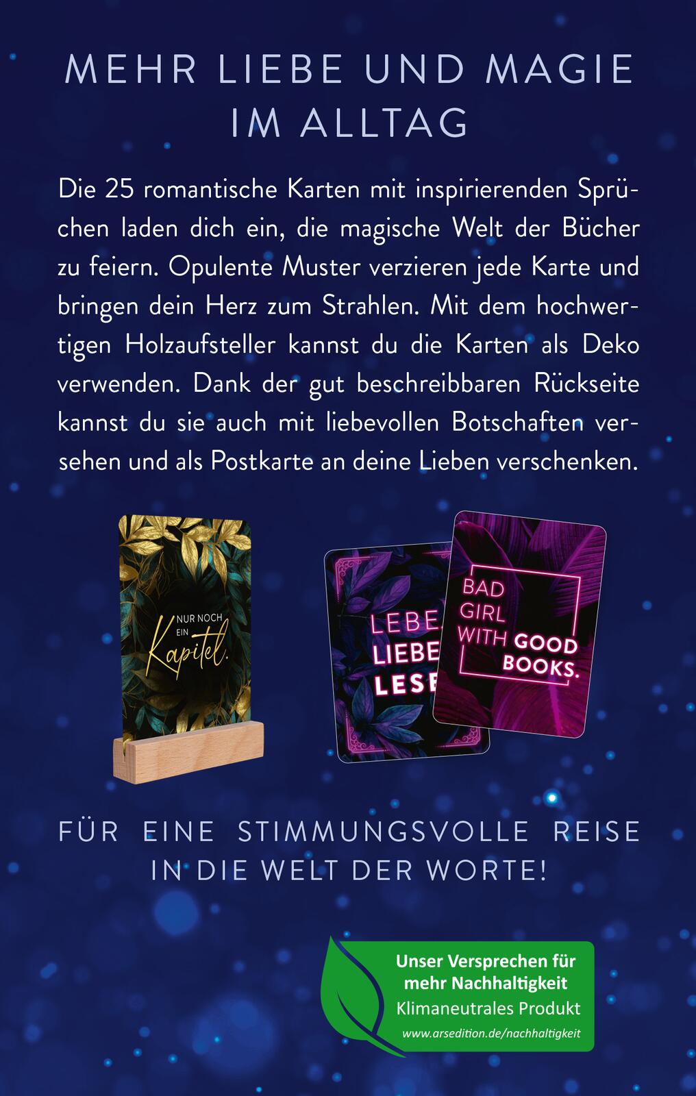 Die ideale Kartenbox für alle Book Lovers! Die Box enthält aufwendig gestaltete Karten mit inspirierenden Sprüchen, Mottos und Wörtern voller Magie rund um die (Buch-)Liebe. Die Botschaften stehen auf gut beschreibbaren Grußkarten. Durch den Tischaufsteller aus Holz werden sie zu einer schönen Deko und schenken überall Freude. Ein ideales Mitbringsel für alle Fans von (Dark) Romance, Fantasy und modernen Liebesromanen.